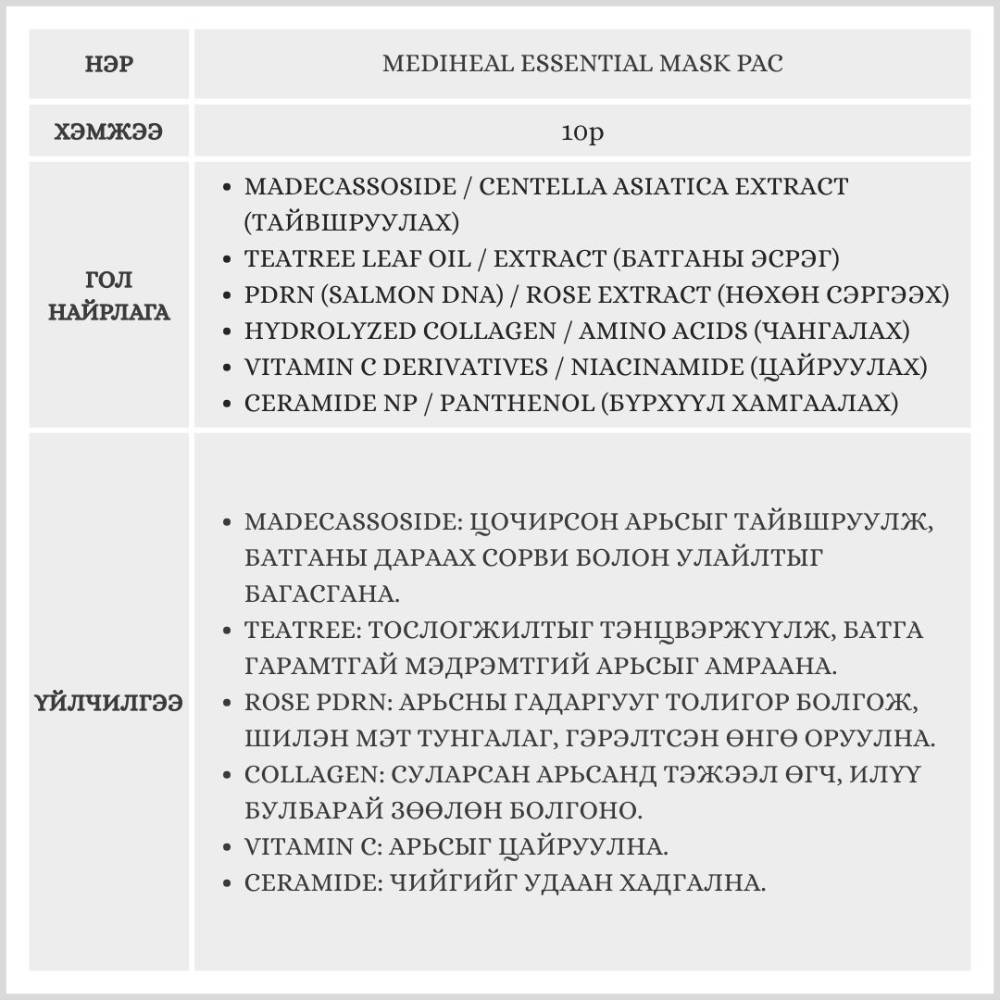 Солонгосын маскны зах зээлд 14 жил дараалан борлуулалтаараа тэргүүлж буй, дэлхийд алдартай Mediheal брэндийн маск юм.