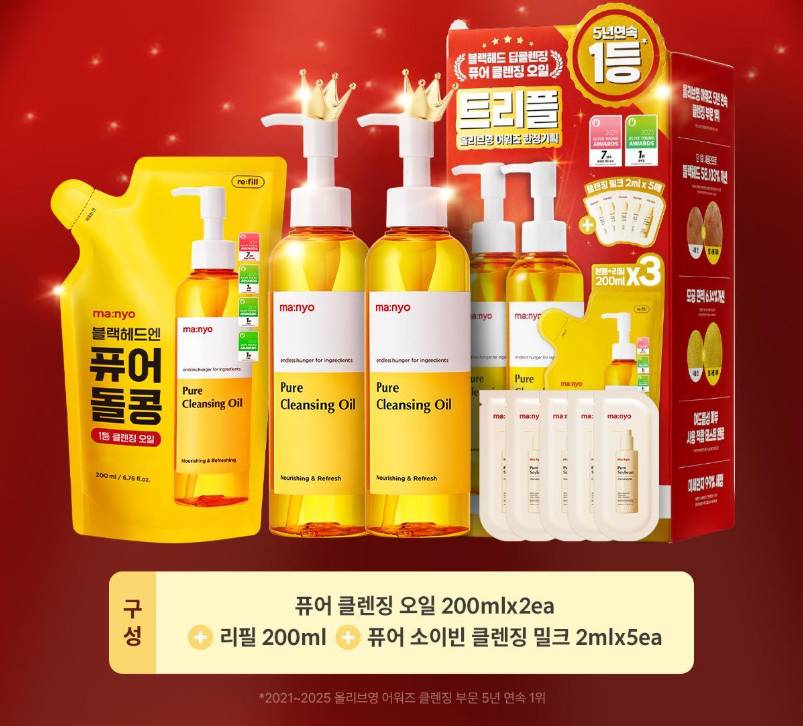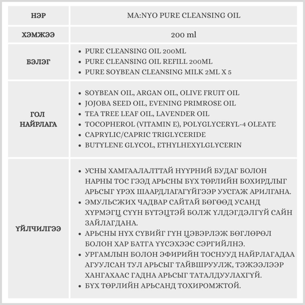 Арьсны бүх төрлийн бохирдлыг гүн цэвэрлэх үйлчилгээтэй тосон цэвэрлэгч. Төрөл бүрийн ургамлын тос найрлагадаа агуулсан тул давхар арьсыг тэжээлээр хангана. Бэлгэнд үндсэн бүтээгдэхүүнээс гадна Manyo Pure тосон цэвэрлэгч 200мл, запас 200мл болон Pure Soybean 20мл сүүн цэвэрлэгч 5 ширхэг дагалдана.