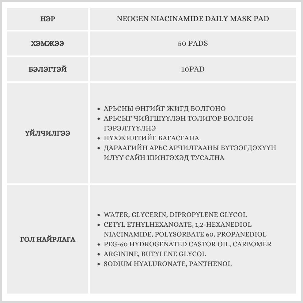 Энэхүү бүтээгдэхүүн нь арьсны өнгийг жигд болгож, гялалзсан гэрэлтсэн төрх өгнө. Арьсыг гүн чийгшүүлж, дараагийн арьс арчилгааны бүтээгдэхүүн илүү сайн шингэхэд тусална. Өдөр тутам хэрэглэхэд тохиромжтой, зөөлөн бүтэцтэй.10 ширхэг пад бэлгэнд дагалдана.