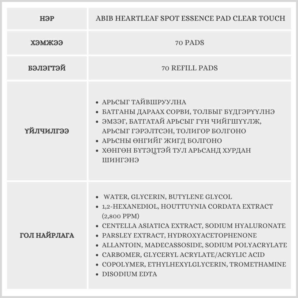 Энэхүү бүтээгдэхүүн нь эмзэг, батгатай арьсыг тайвшруулж, батганы сорвийг бүдгэрүүлнэ. Арьсыг гүн чийгшүүлж, өнгийг жигд болгон гэрэлтсэн, толигор харагдуулна. Хөнгөн бүтэцтэй тул арьсанд хурдан шингэнэ. Бэлгэнд 70 ширхэг запас дагалдана.