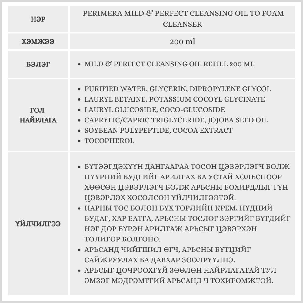 Perimera Mild & Perfect тосон цэвэрлэгч нь устай хольсноор хөөсөн цэвэрлэгч болдог 2in1 үйлчилгээтэй бүтээгдэхүүн юм. Арьсны бүх төрлийн бохирдлыг гүн цэвэрлэх 2 шатлалт цэвэрлэгээг нэг бүтээгдэхүүнээр хийх боломжийг олгоно. Бэлгэнд Mild & Perfect 200 мл тосон цэвэрлэгчийн запас дагалдана.