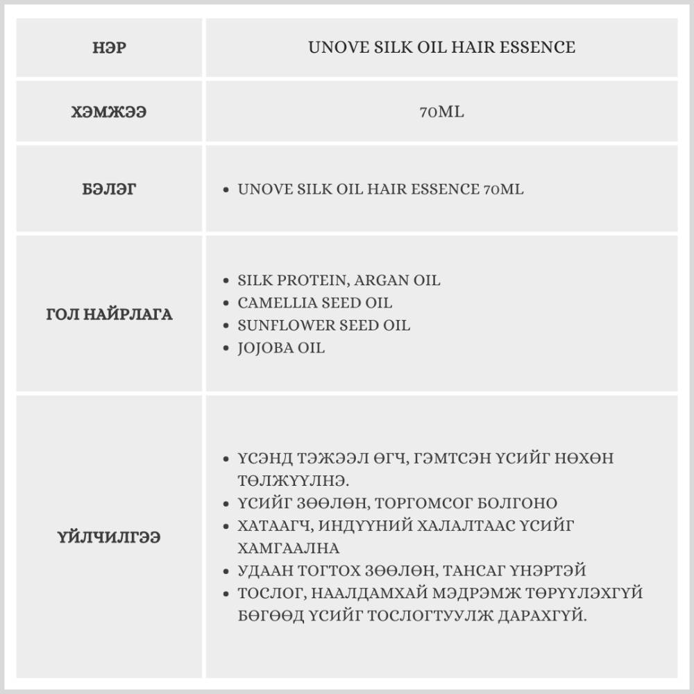 Үсэнд тэжээл өгч, гэмтсэн үсийг нөхөн төлжүүлнэ. Тослог, наалдамхай мэдрэмж төрүүлэхгүй. 1+1 урамшуулалтай, өхөөрдөм мини сам бэлгэнд дагалдана.