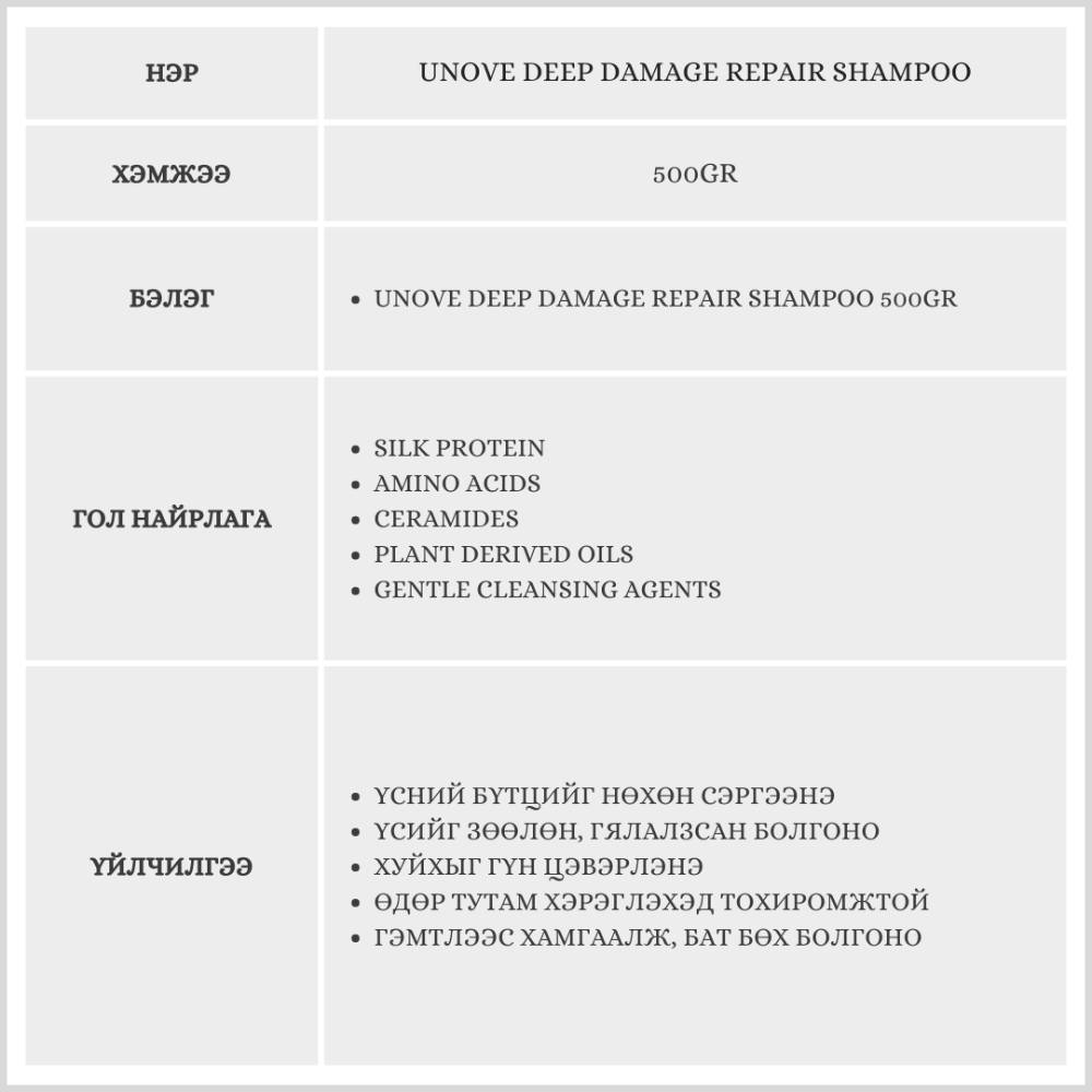 Гэмтсэн үсийг гүн тэжээж, үсний бүтцийг нөхөн сэргээнэ. Үсийг зөөлөн, гялалзсан болгож, арзайлтыг багасгана. Хуйхыг зөөлөн цэвэрлэж, өдөр тутмын хэрэглээнд тохиромжтой.
