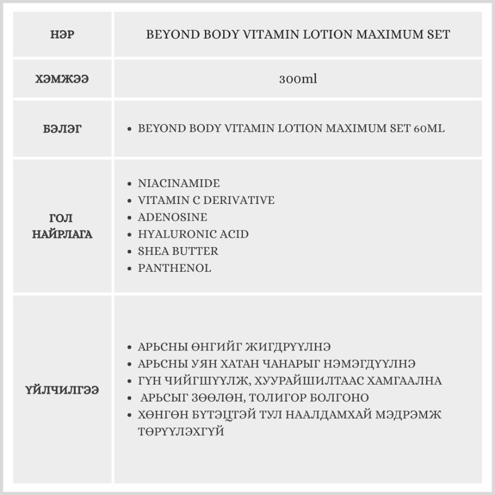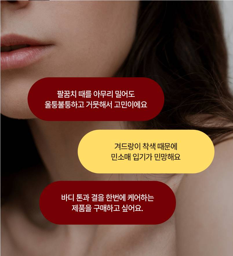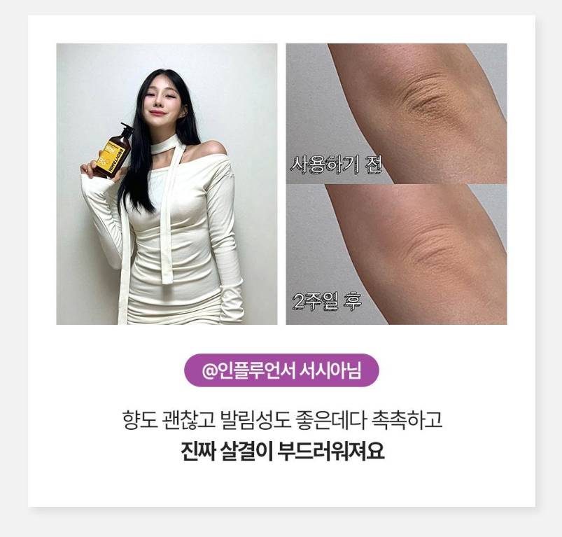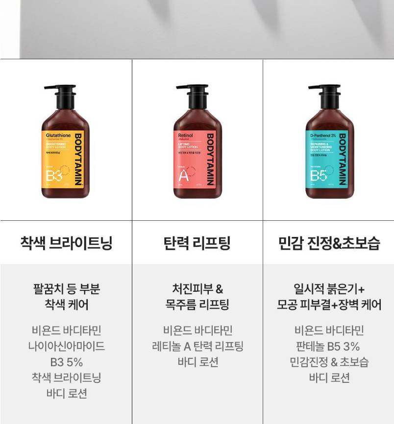 Энэхүү бүтээгдэхүүн нь 3 төрөлтэй. Шар нь арьсны өнгийг жигдрүүлж, тохой, өвдөг зэрэг харласан хэсгийг цайруулна.Улаан нь арьсны уян хатан чанарыг нэмэгдүүлж, суларсан арьсыг чангална.Ногоон нь арьсыг тайвшруулж, гүн чийгшүүлэх үйлчилгээтэй.