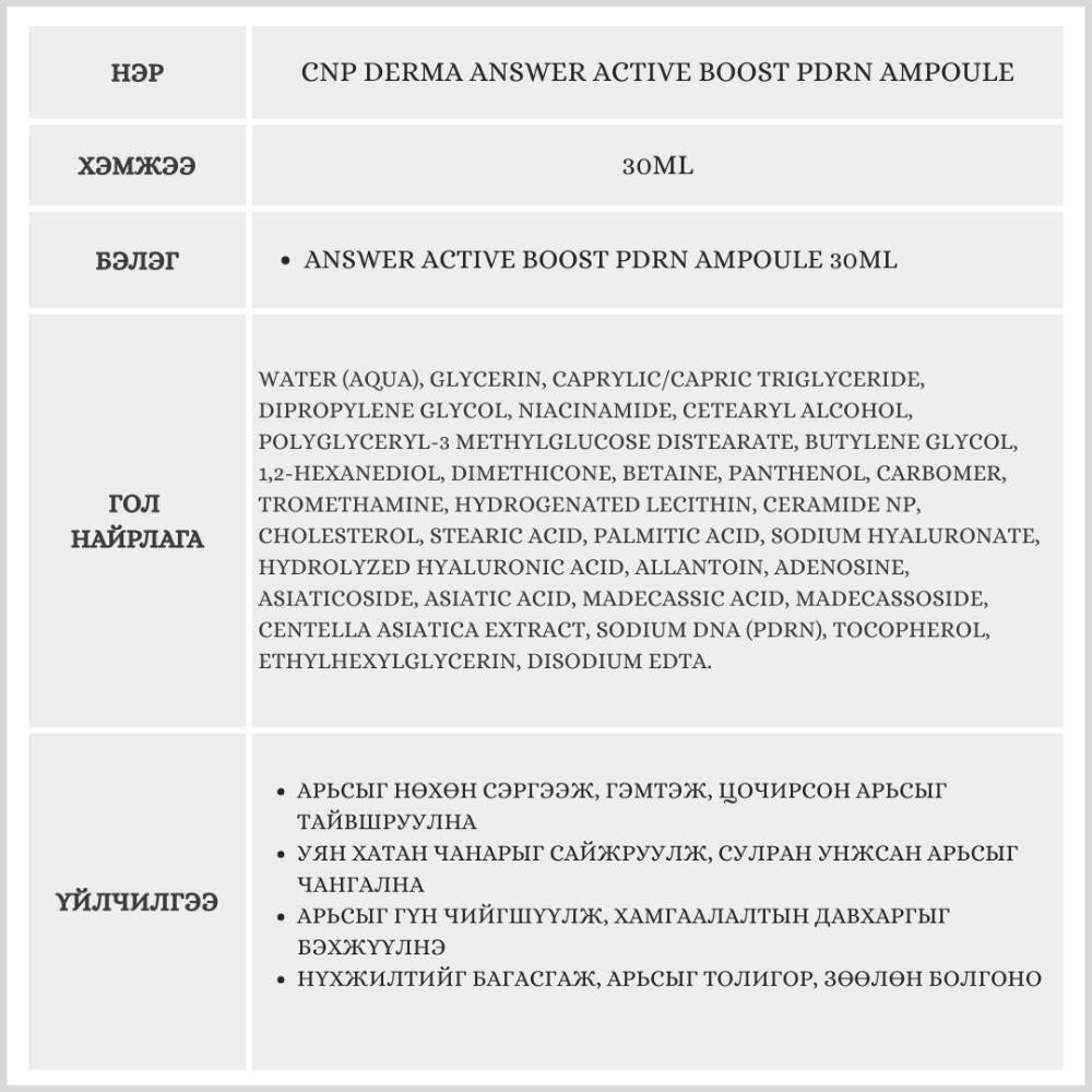 [Бэлэгтэй] 1+1 CNP Derma Answer Active Boost PDRN Ampoule, 30 ml /Ампуль/OY