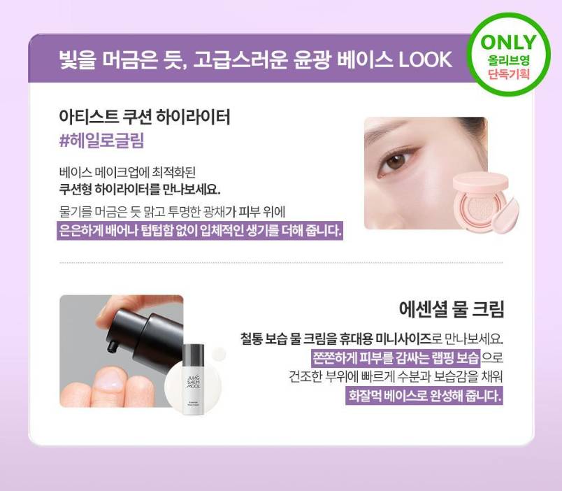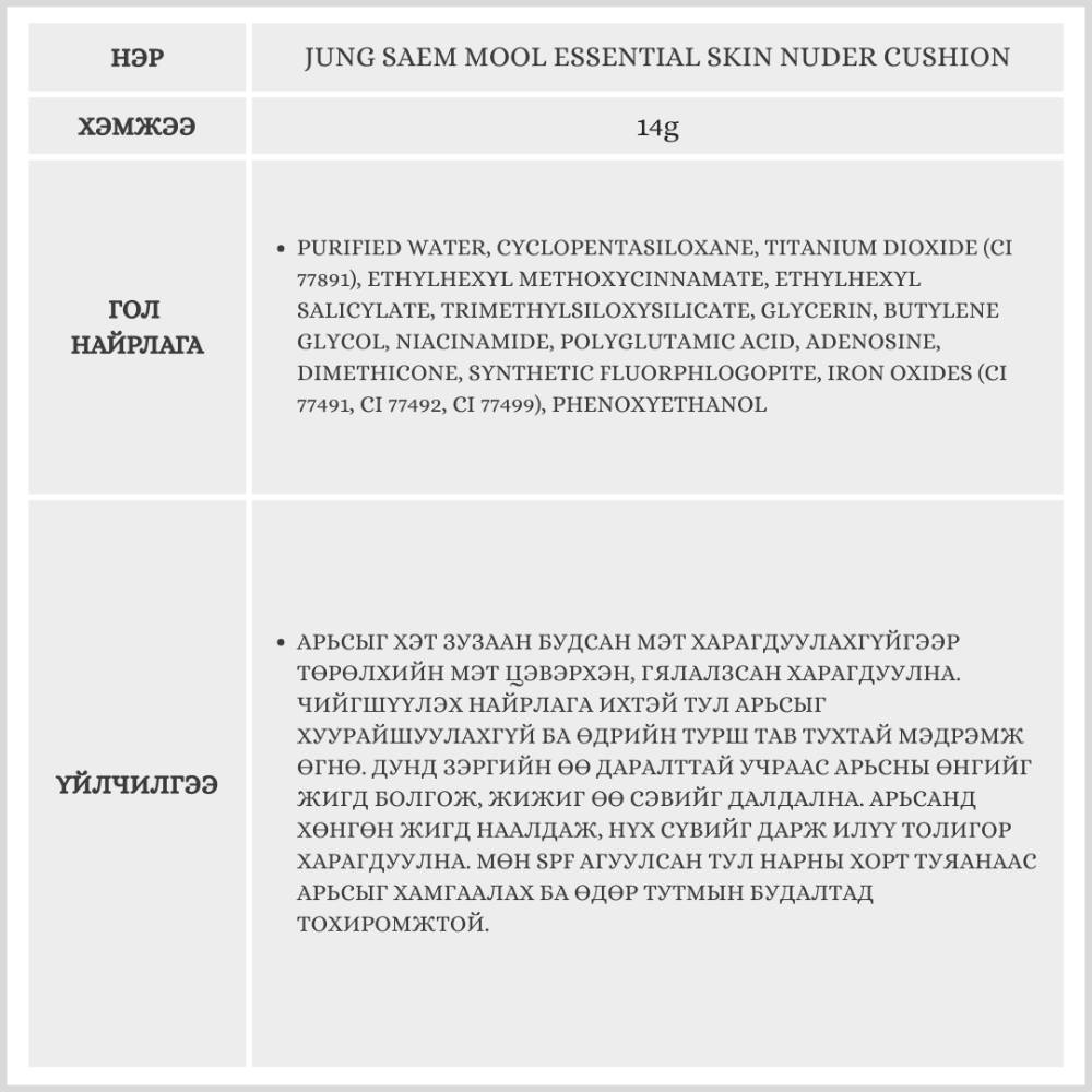 Арьсны өө сэвийг дарж, гэрэлтсэн толигор харагдуулах cushion. Чийгшүүлэх үйлчилгээтэй тул будалт барзайж харагдахгүй. Бэлгэнд үндсэн бүтээгдэхүүний запас, artist cushion мини гэрэлтүүлэгч, 8мл хэмжээтэй water cream тос болон порлон 2ш дагалдана.