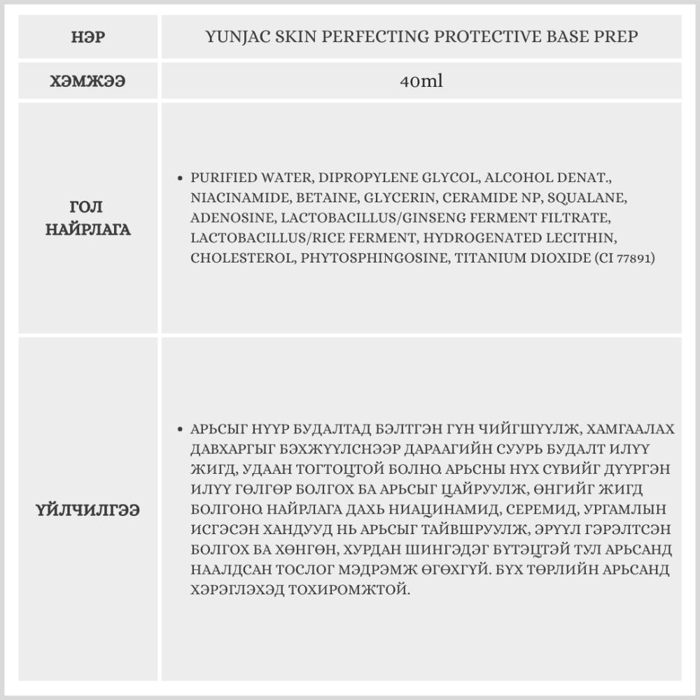 Yunjac Skin Perfecting Protective Base Prep нь арьсыг чийгшүүлж, нүүр будалтад бэлтгэн гөлгөр болгох үйлчилгээтэй серум маягийн силиконгүй бэйс. Будгийн наалдац болон тогтцыг сайжруулан арьсыг хамгаалж хуурайшилтаас сэргийлдэг бүтээгдэхүүн юм. Бэлгэнд 10мл Base Prep болон порлон дагалдана.