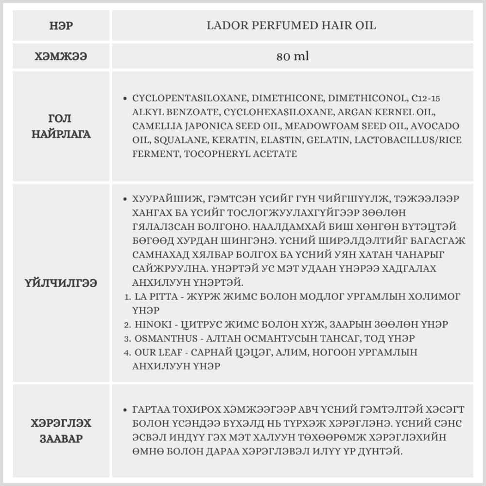 Үсийг чийгшүүлж, тэжээлээр хангах үйлчилгээтэй үсний анхилуун үнэрт тос. Үсний ширэлдэлтийг багасгаж уян хатан чанарыг нэмэгдүүлнэ. 4 төрлийн үнэрийн сонголттой. Бэлгэнд 10мл хэмжээтэй үсний тос /үнэр сонгох боломжгүй/ дагалдана.
