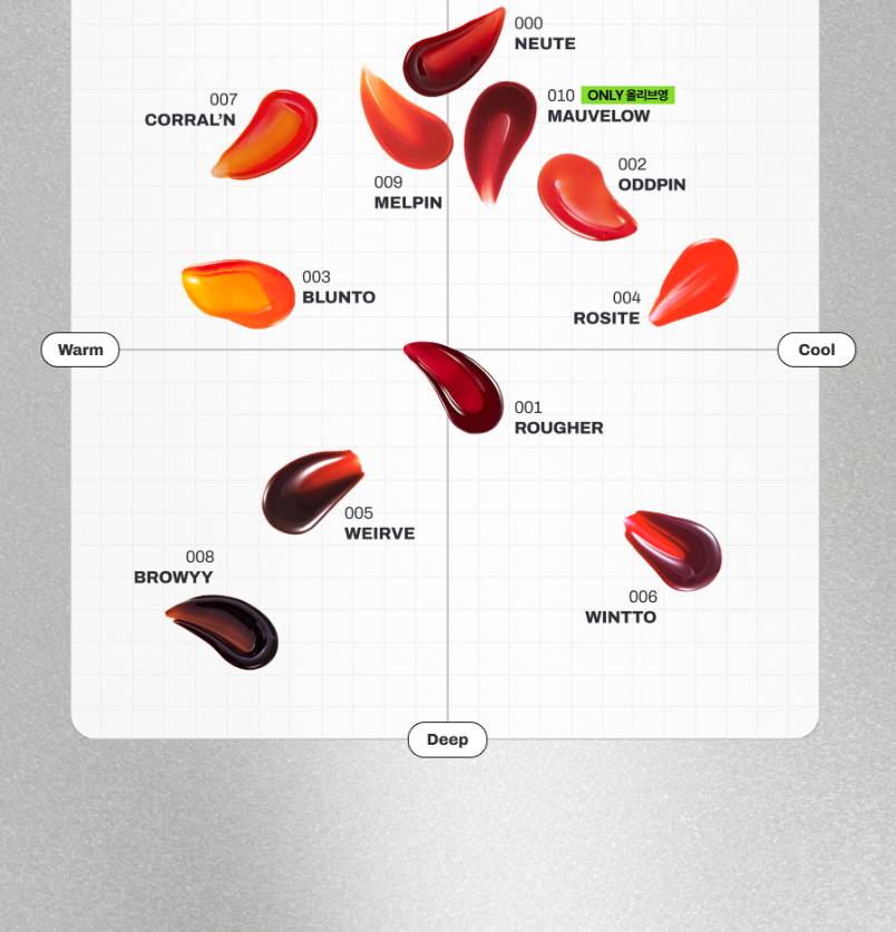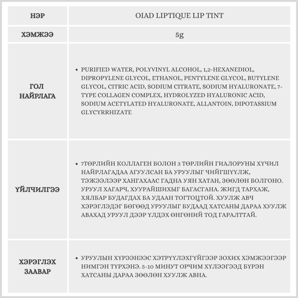 Уруулыг чийгшүүлж, тэжээлээр хангах үйлчилгээтэй хуулж авдаг уруулын тинт. Өнгөний тод гаралттай ба удаан тогтоцтой. Бэлгэнд мини уруулын балм дагалдана.