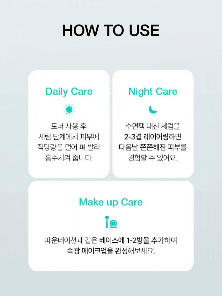 Энэхүү бүтээгдэхүүн нь жижиг молекул агуулсан учир арьсны гүнд нэвтэрч үрчлээг багасган чийгшүүлнэ.Өнгөө алдсан арьсыг жигд болгож, нөхөн төлжүүлэн эрүүл, толигор харагдуулна