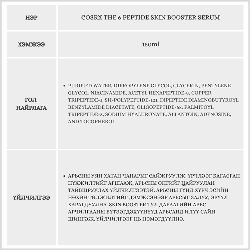 Энэхүү бүтээгдэхүүн нь арьс арчилгааны хамгийн эхний шатанд хэрэглэдэг, арьсны бүтэцийг сайжруулах олон үйлчилгээг нэг дор агуулсан booster серум юм.
