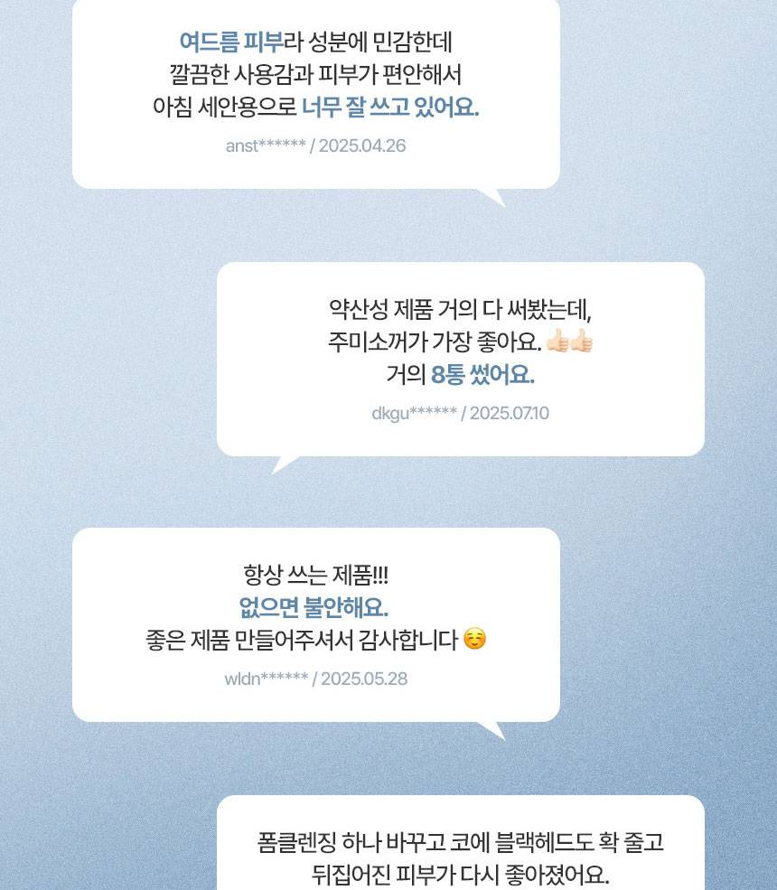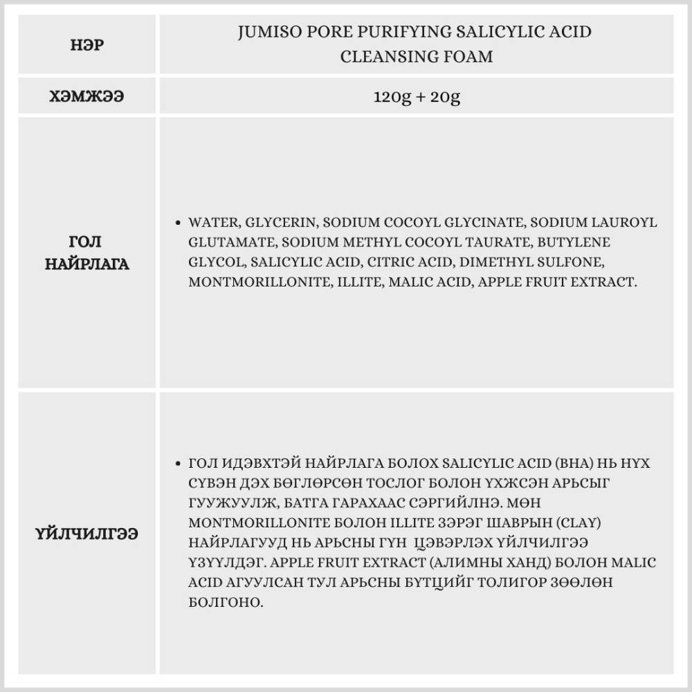 Энэхүү бүтээгдэхүүн нь БНСУ-ын Хүнс, Эмийн аюулгүй байдлын газар KFDA-аас батлагдсан, батгатай арьсыг тайвшруулах үйлчилгээтэй нүүрний хөөсөн цэвэрлэгч юм. Илүүдэл тос, нүх сүвний бохирдлыг сайн цэвэрлэж, арьсыг цэвэр, эрүүлжүүлнэ. Бэлгэнд 20гр хөөсөн цэвэрлэгч дагалдана.
