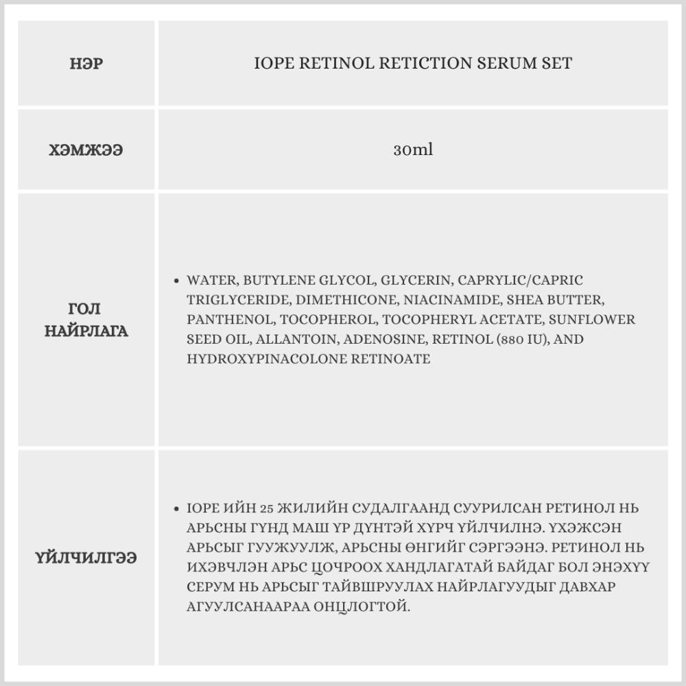 Энэхүү серум нь үрчлээний эсрэг идэвхтэй найрлагатай бөгөөд арьсны хөгшрөлтийн шинж тэмдгийг мэдэгдэхүйц багасгана.Арьсны нөхөн төлжилтийг дэмжиж, томорсон нүхжилтийг агшаан, арьсны гадаргууг толигор, жигд болгоно. 25 мл ижил бүтээгдэхүүн бэлгэнд дагалдана.