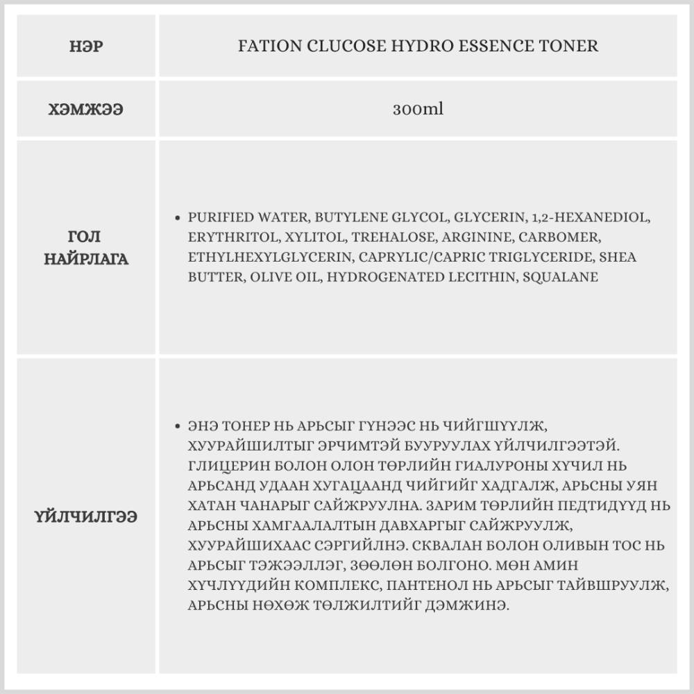 Энэхүү эссенц тонер нь арьсны давхарга бүрт хүрч, хуурайшлыг богино хугацаанд бууруулан, арьсыг гүнээс нь чийгшүүлэх үйлчилгээтэй бүтээгдэхүүн юм. Хөнгөн бөгөөд эссенц бүтэцтэй тул арьсанд жигд шингэж, удаан хугацаанд чийгийг хадгална. Бэлгэнд 300мл савлагаатай адил бүтээгдэхүүн дагалдана.