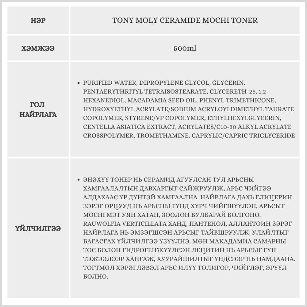 Энэхүү тонер нь арьсны хамгаалалтын давхаргыг сайжруулан, чийгийг гадагш алдахаас сэргийлнэ. Хуурайшсан, цочирдсон арьсыг нөхөн төлжүүлнэ. Тогтмол хэрэглэснээр арьсыг зөөлөн, булбарай, чийглэг болгоно. Бэлгэнд 100мл савлагаатай адил бүтээгдэхүүн болон 30мл савлагаатай чийгшүүлэх тос дагалдана.