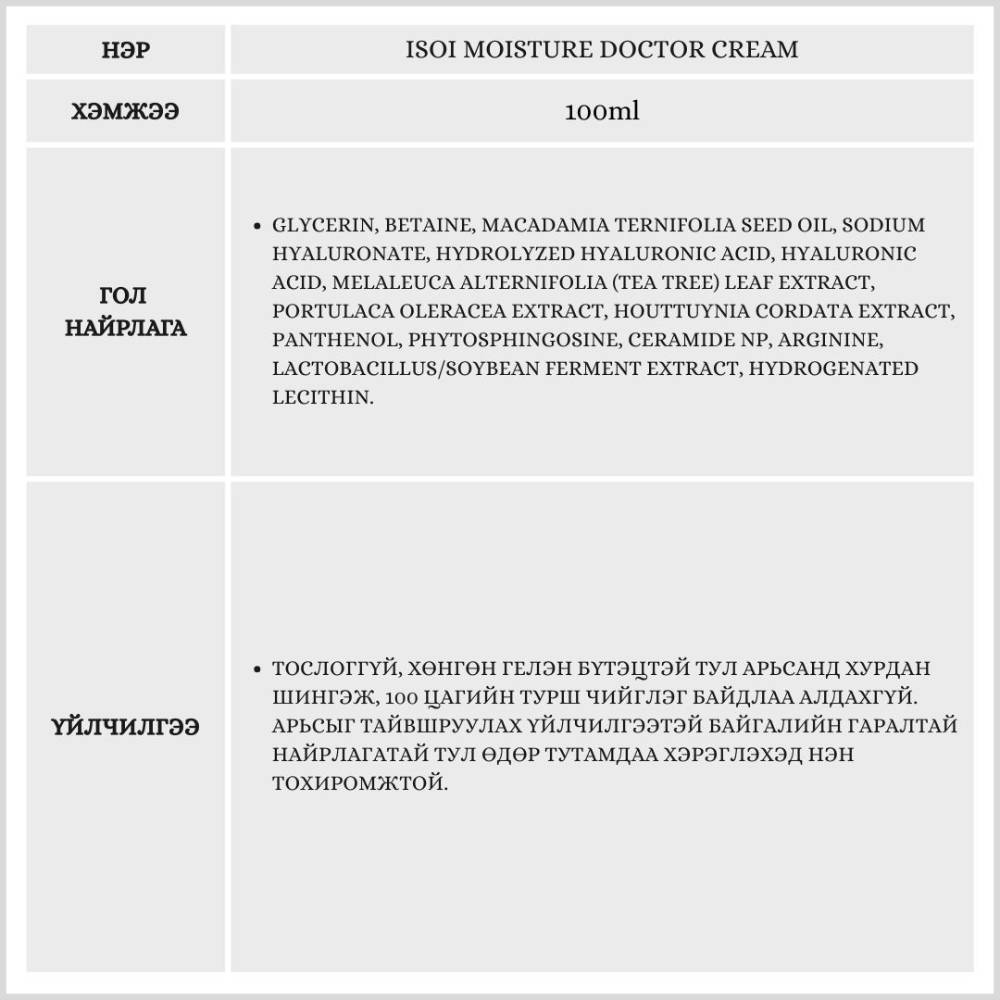 Энэхүү тос нь арьсны гүнээс чийгшүүлж, арьсны хамгаалалтын давхаргыг бэхжүүлэх үйлчилгээтэй. Гурван төрлийн гиалуроны хүчил болон цайны модны хандыг агуулсан тул эмзэг арьсанд ч тохиромжтой. Бэлгэнд тос 10гр болон картны гэр дагалдана.