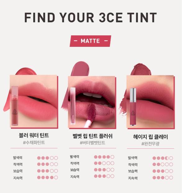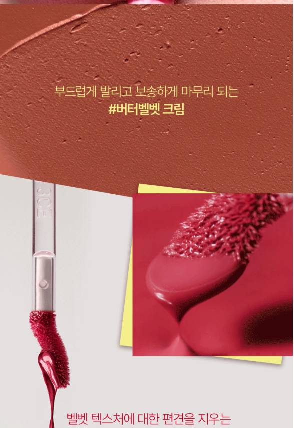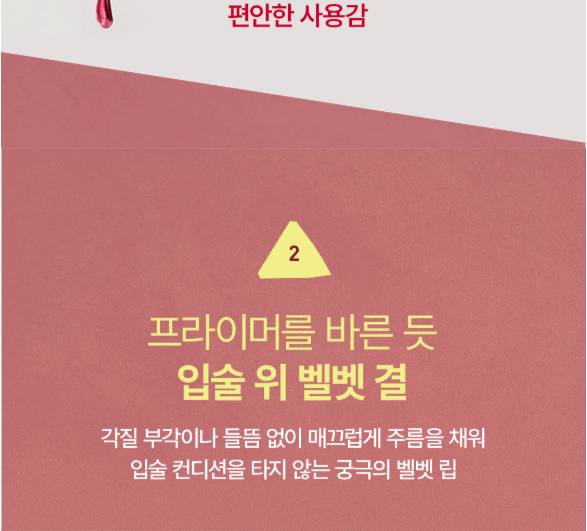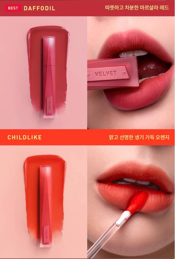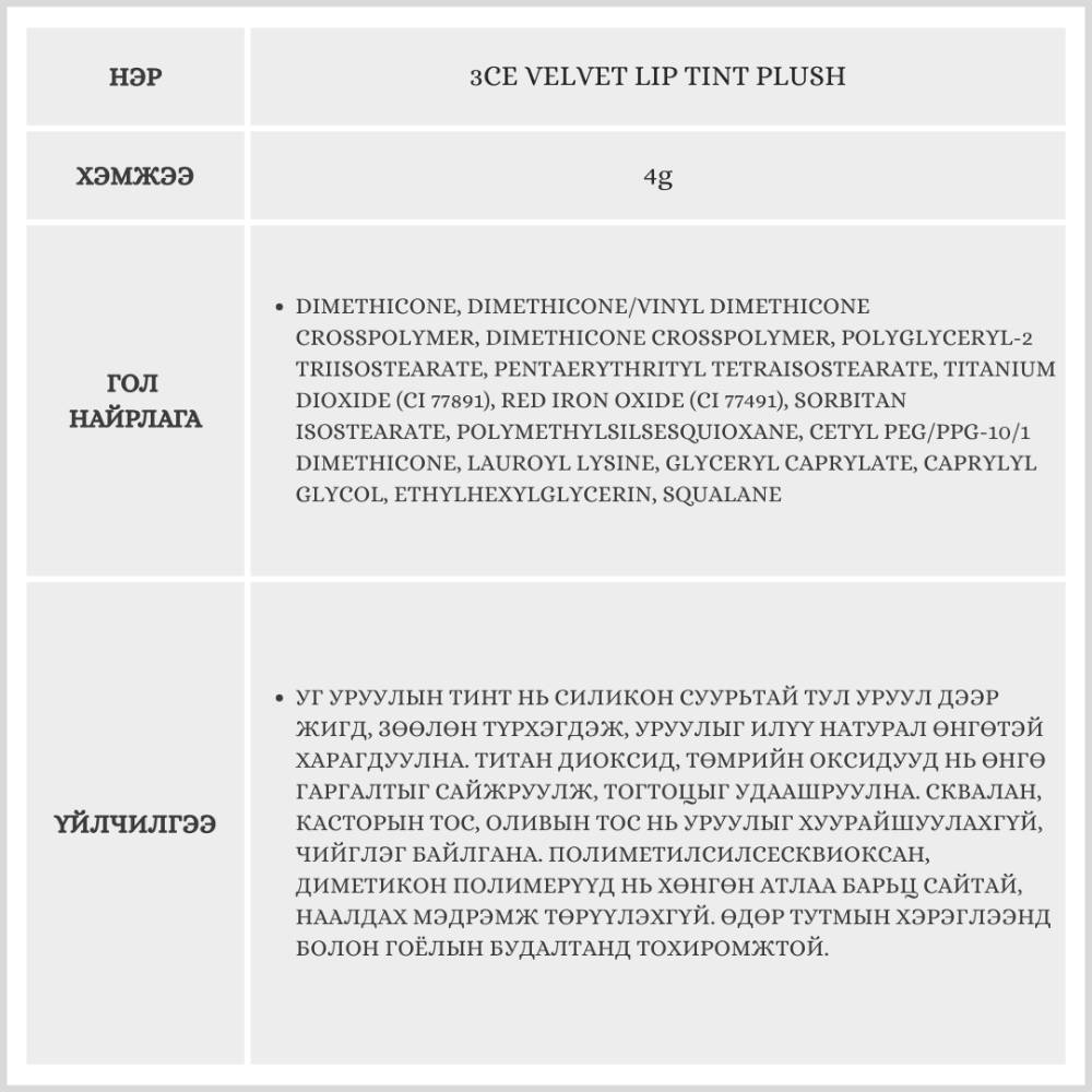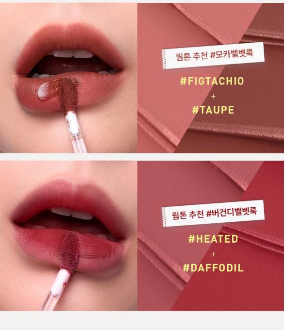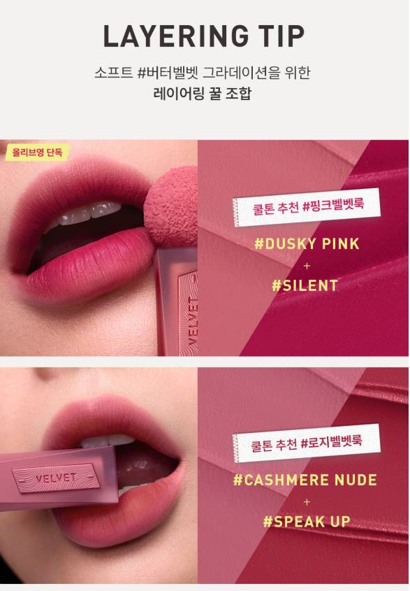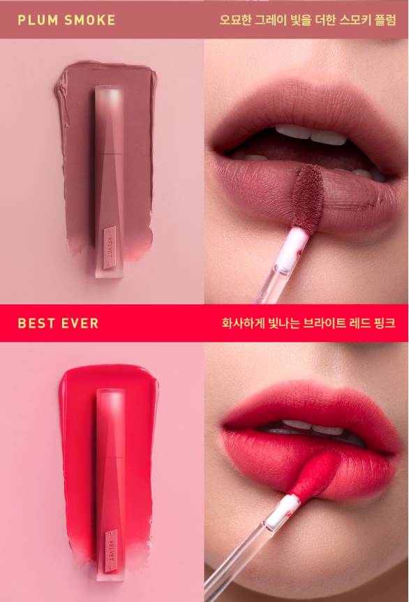 Энэхүү бүтээгдэхүүн нь зөөлөн, матт velvet өнгө төрхийг гаргах ба удаан тогтоцтой тул өдрийн турш өнгөө хадгална. Матте гаралттай тул уруулыг илүү натурал харагдуулах болно. Матте гаралттай ч уруулыг хуурайшуулахгүй давуу талтай. Бэлгэнд жижиг уруулын тинт дагалдана.