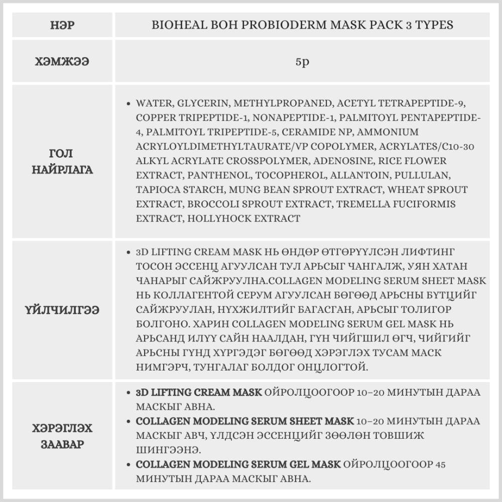 Энэхүү бүтээгдэхүүн нь 3 төрөлтэй бөгөөд өөрийн арьсны онцлогт тохируулан сонгон авах боломжтой.Бэлгэнд 1 ширхэг маск дагалдана.