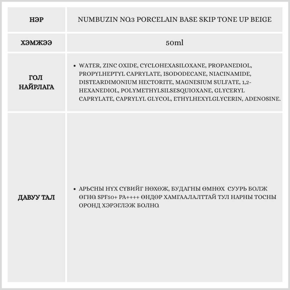 Крем хэрэглэх шаардлагагүйгээр арьсыг толигор харагдуулах tone up юм. Бэлгэнд 35мл ижил бүтээгдэхүүн болон шпатель дагалдана.