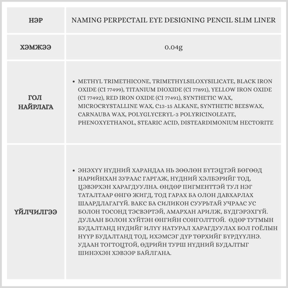 Энэхүү бүтээгдэхүүн нь нүдний будалтыг нарийнхан, цэвэрхэн харагдуулах үйлчилгээтэй, нүдийг илүү натурал харагдуулах нимгэн үзүүртэй нүдний харандаа юм. Ус болон тосны хамгаалалттай учир амархан урсахгүй, тогтоц сайтай бүтээгдэхүүн юм. Бэлгэнд өөр өнгийн 1 харандаа дагалдана.