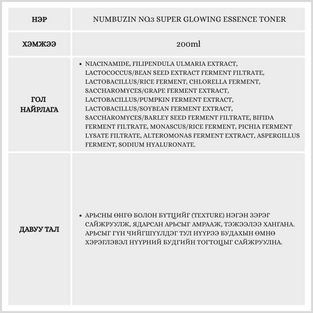 Арьсанд тэжээл өгч гэрэлтсэн толигор байлгах 52 төрлийн исгэсэн найрлагатай "Essence" төрлийн тонер юм. Бэлгэнд запас 250мл дагалдана.