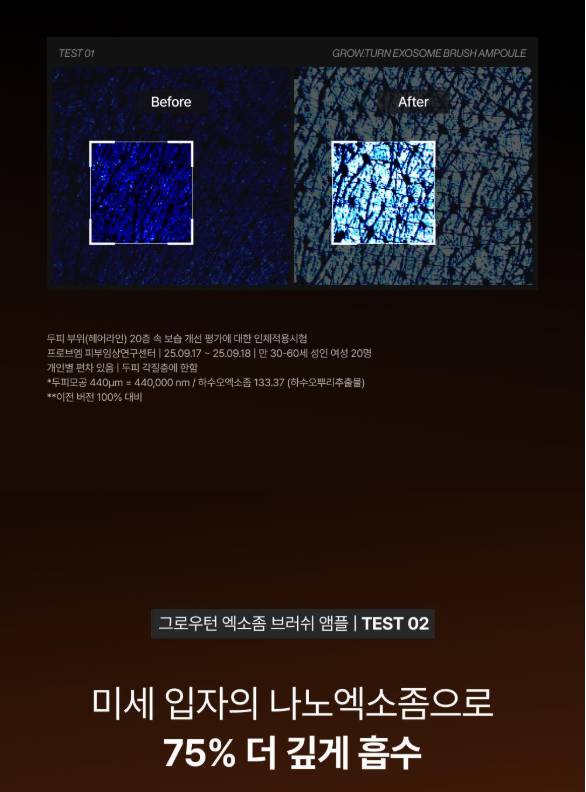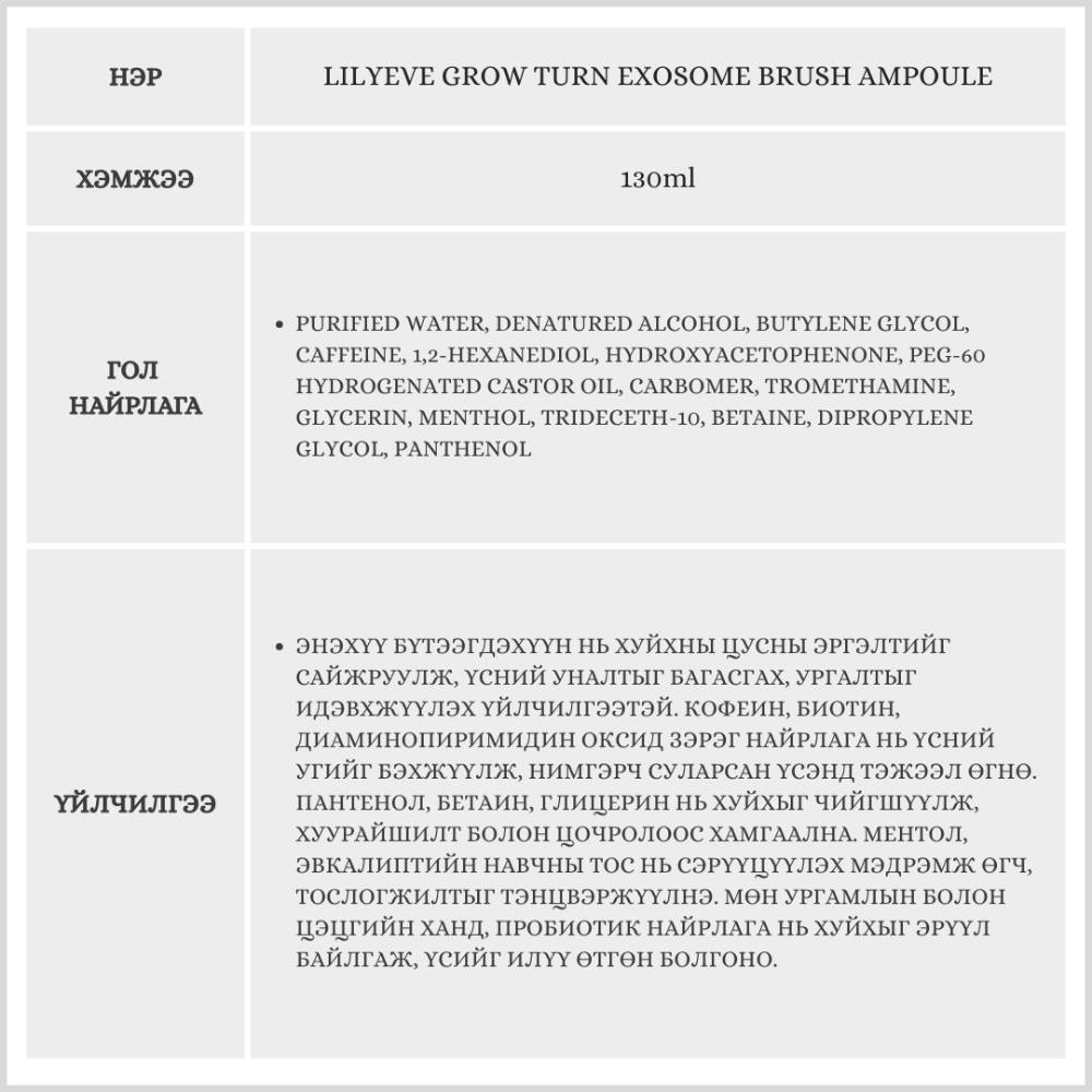 Энэхүү бүтээгдэхүүн нь хошуундаа самтай бөгөөд үсэнд тэжээл өгөх, массаж хийх үйлчилгээтэй үсний ампуль юм. Exosome найрлагатай тул үсний угийг тэжээлээр хангаж, хуйхны нөхөн төлжилтийг сайжруулна. Бэлгэнд 30мл савлагаатай адил бүтээгдэхүүн дагалдана.