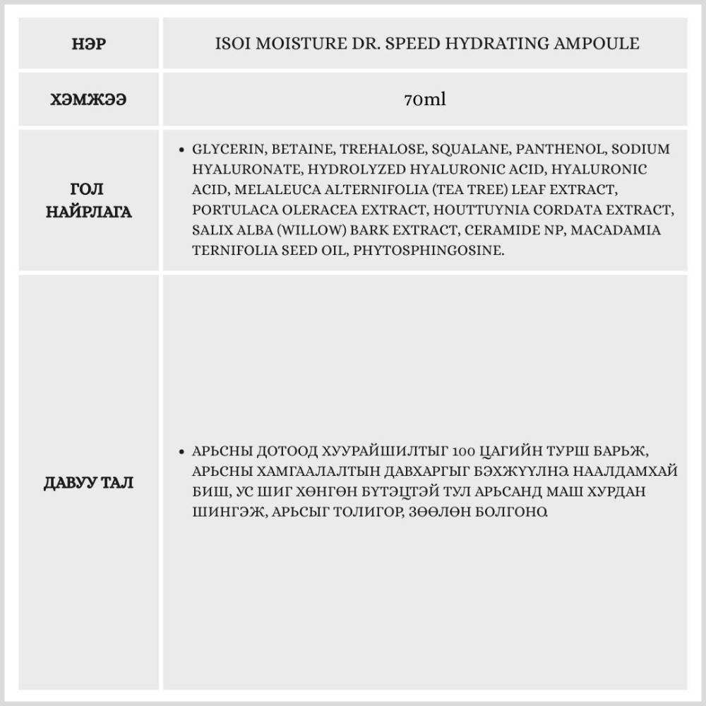 Арьсыг маш хурдан хугацаанд гүн чийгшүүлж, тайвшруулах үйлчилгээтэй ампуль юм. 5 төрлийн гиалуроны хүчил болон цайны модны ханд агуулсан тул эмзэг арьсанд ч тохиромжтой. Бэлгэнд нь 10мл тос болон түлхүүрийн тос дагалдана.