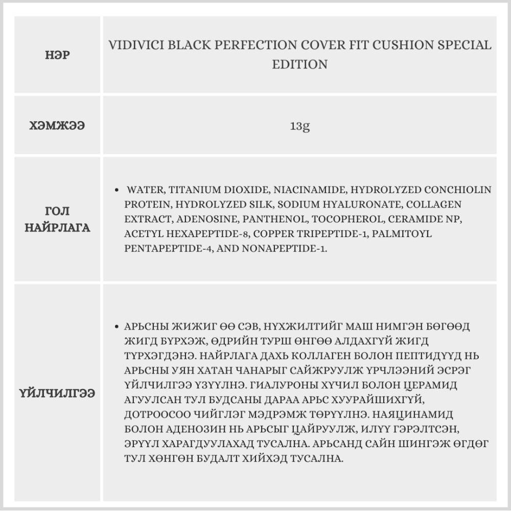 Энэхүү бүтээгдэхүүн нь өө сэвийг маш сайн дарахаас гадна олон төрлийн пептид коллаген агуулсан тул нүүр будалт болон арьс арчилгааг нэг дор шийдсэн бүтээгдэхүүн юм. Арьсыг гялалзсан, толигор харагдуулахын зэрэгцээ үрчлээний эсрэг, цайруулах давхар үйлчилгээтэй.