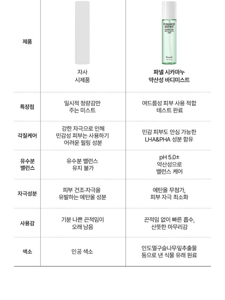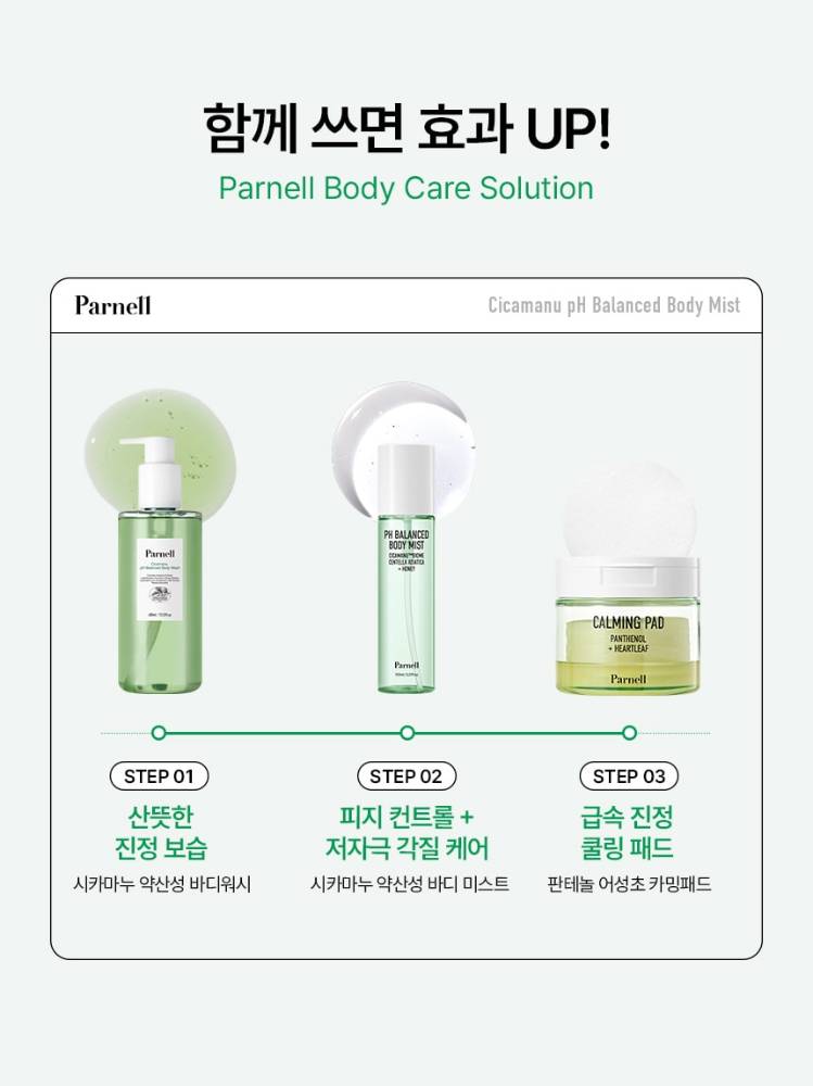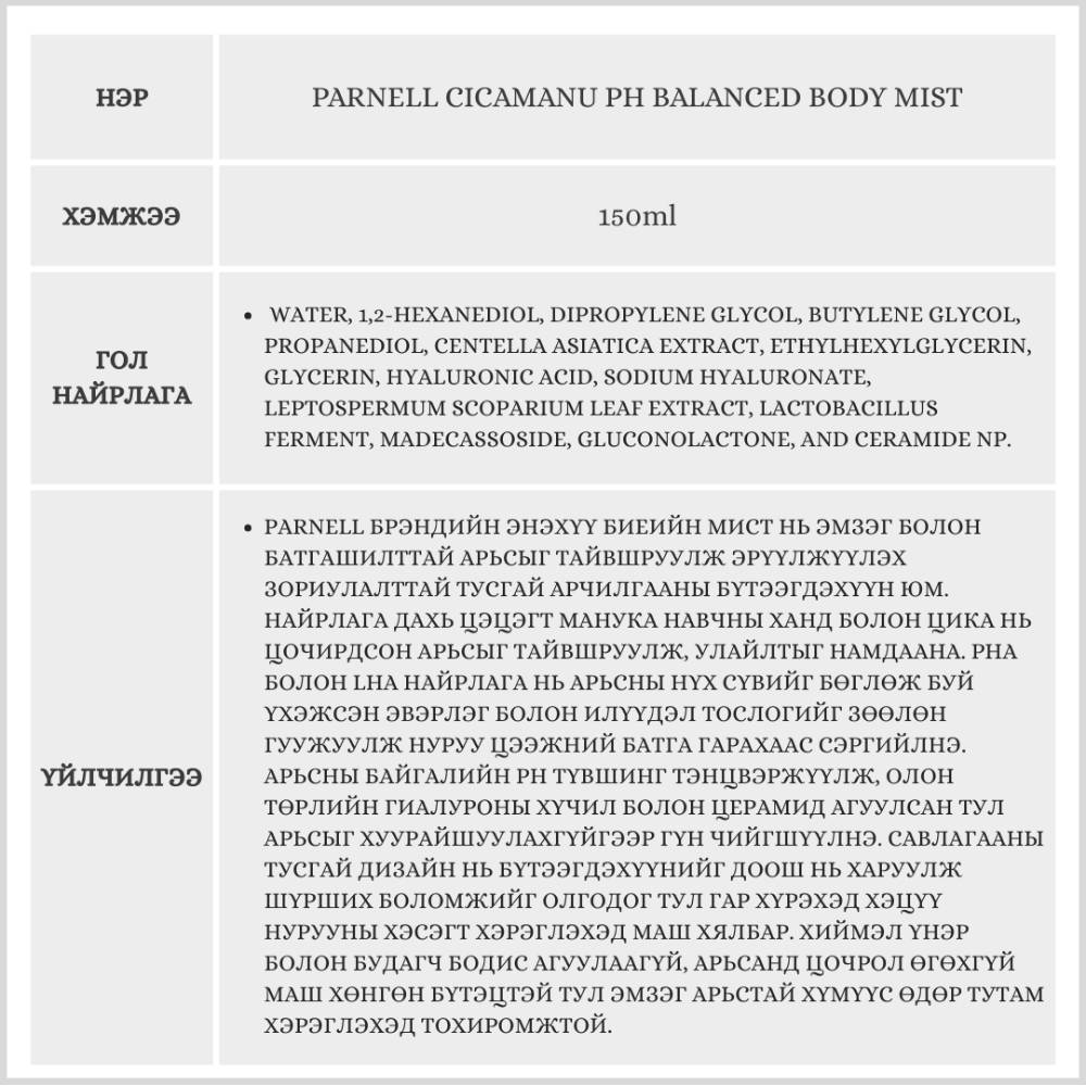 Энэхүү мист нь Панелл брэндийн арьсны рН балансыг тэнцвэржүүлж нуруу болон цээжин дээрх батгашилтыг намдааж цочирдсон арьсыг тайвшруулах үйлчилгээтэй.