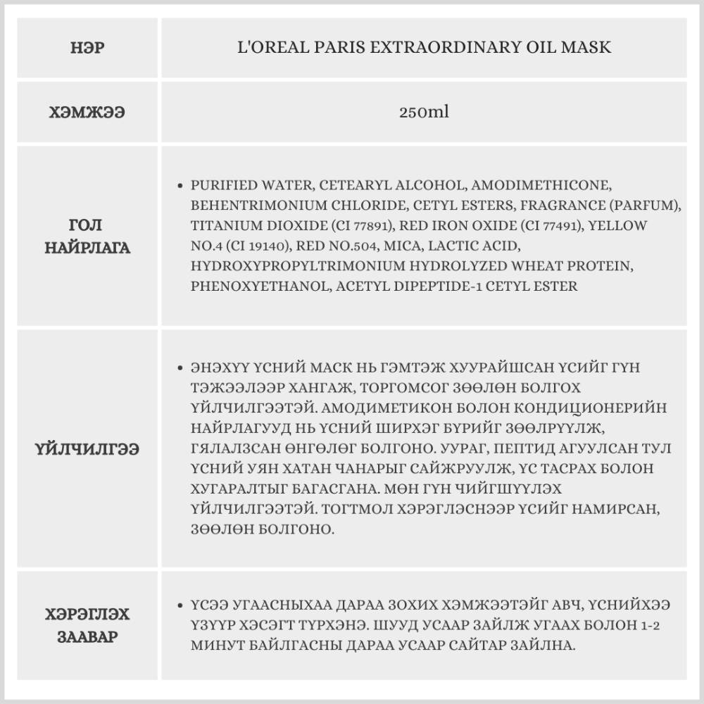 Энэхүү үсний маск нь гэмтэлтэй болон хуурайшсан үсэнд эрчимтэй тэжээл өгөх үйлчилгээтэй L'Oreal Paris брэндийн шилдэг бүтээгдэхүүнүүдийн нэг юм. Тогтмол хэрэглэвэл үс илүү бат бөх, уян хатан болж, үс хугаралт багасна. Бэлгэнд 250мл савлагаатай адил бүтээгдэхүүн /запас/ дагалдана.