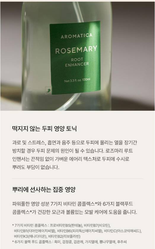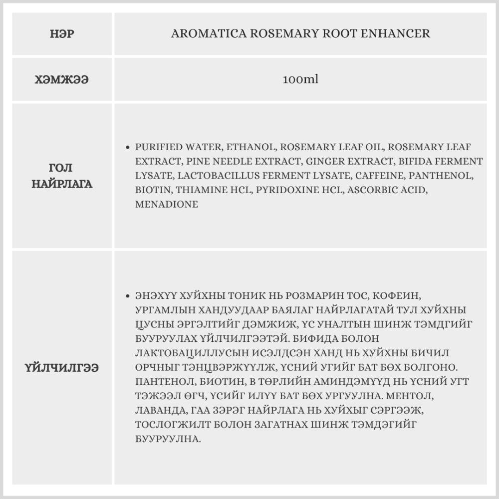 Энэхүү хуйхны тоник нь үсний хуйханд цацаж хэрэглэх зориулалттай бөгөөд үс уналтыг багасгах, үсийг илүү бат бөх ургуулах, хуйхыг тайвшруулах үйлчилгээтэй Aromatica брэндийн борлуулалт өндөртэй бүтээгдэхүүн юм. Бэлгэнд 100мл савлагаатай адил бүтээгдэхүүн дагалдана.