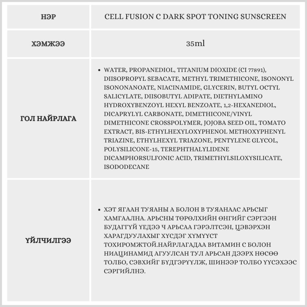Энэхүү нарны тос нь зөвхөн нарны тусгалаас хамгаалаад зогсохгүй арьсны өнгийг засах, цайруулах үйлчилгээтэй. Бэлгэнд ижил бүтээгдэхүүн дагалдана.