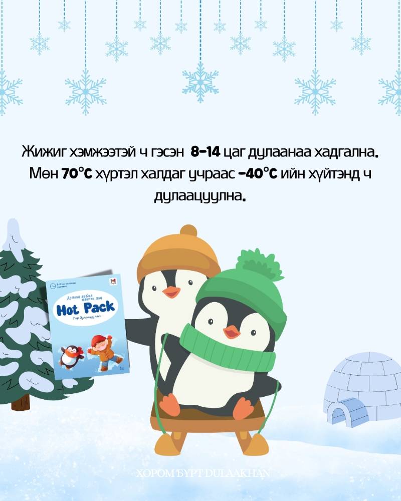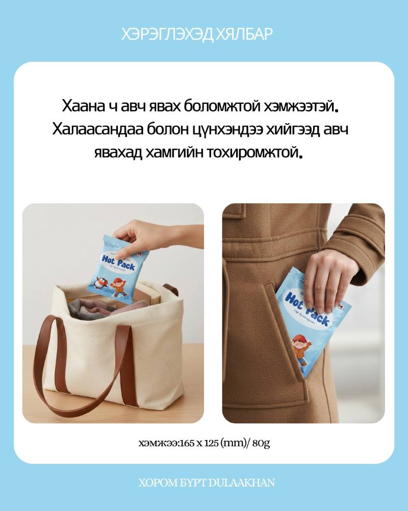 Өвлийн хүйтэн өдрүүдийг дулаанаар дүүргэе Халаасанд багтах гар дулаацуулагчаа уутнаас нь гаргаж л сэгсрээд дулааныг мэдрээрэй.