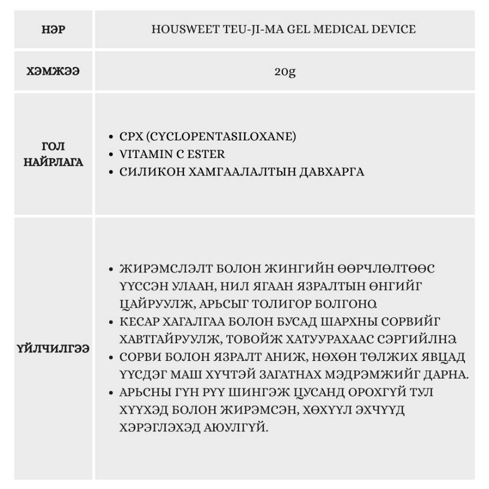 Энэхүү гель нь арьсны язралт болон төрөл бүрийн сорвины хагалгааны, түлэгдэлтийн өнгийг бүдгэрүүлж, бүтцийг нь засна.