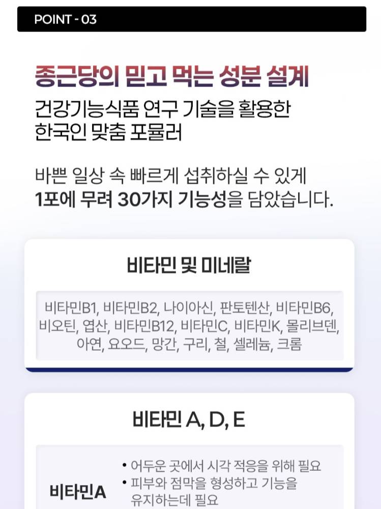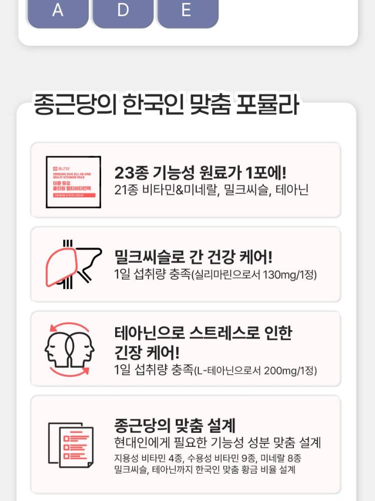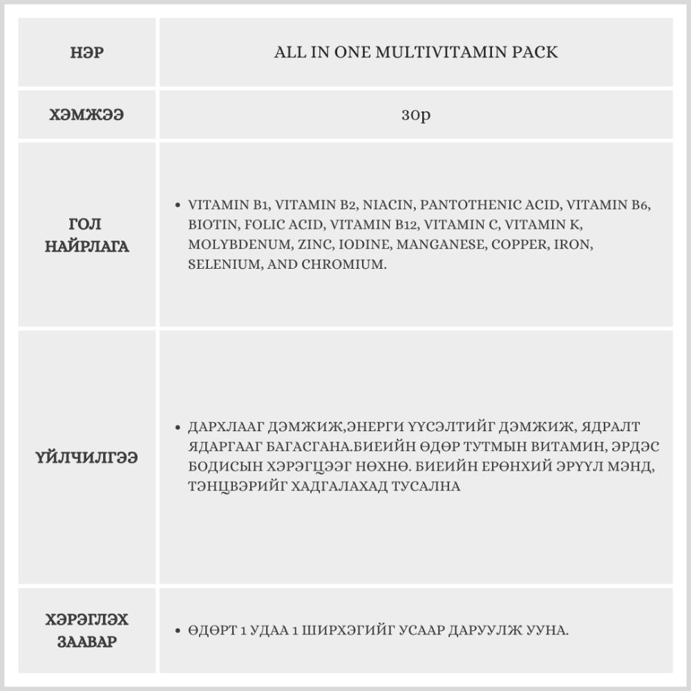 Энэхүү мулти витамин элэг хамгаалах болон стресс бууруулах зэрэг нэмэлт үйлчилгээтэй найрлагуудыг багтаасан тул "Бүгдийг нэг дор" эрдэс бодисоо авах боломжтой.Олон төрлийн савтай витаминуудыг тус тусад нь онгойлгох шаардлагагүй. Өдөрт нэг уутыг уухад л танд хэрэгтэй бүх шим тэжээлийг авч чадна.