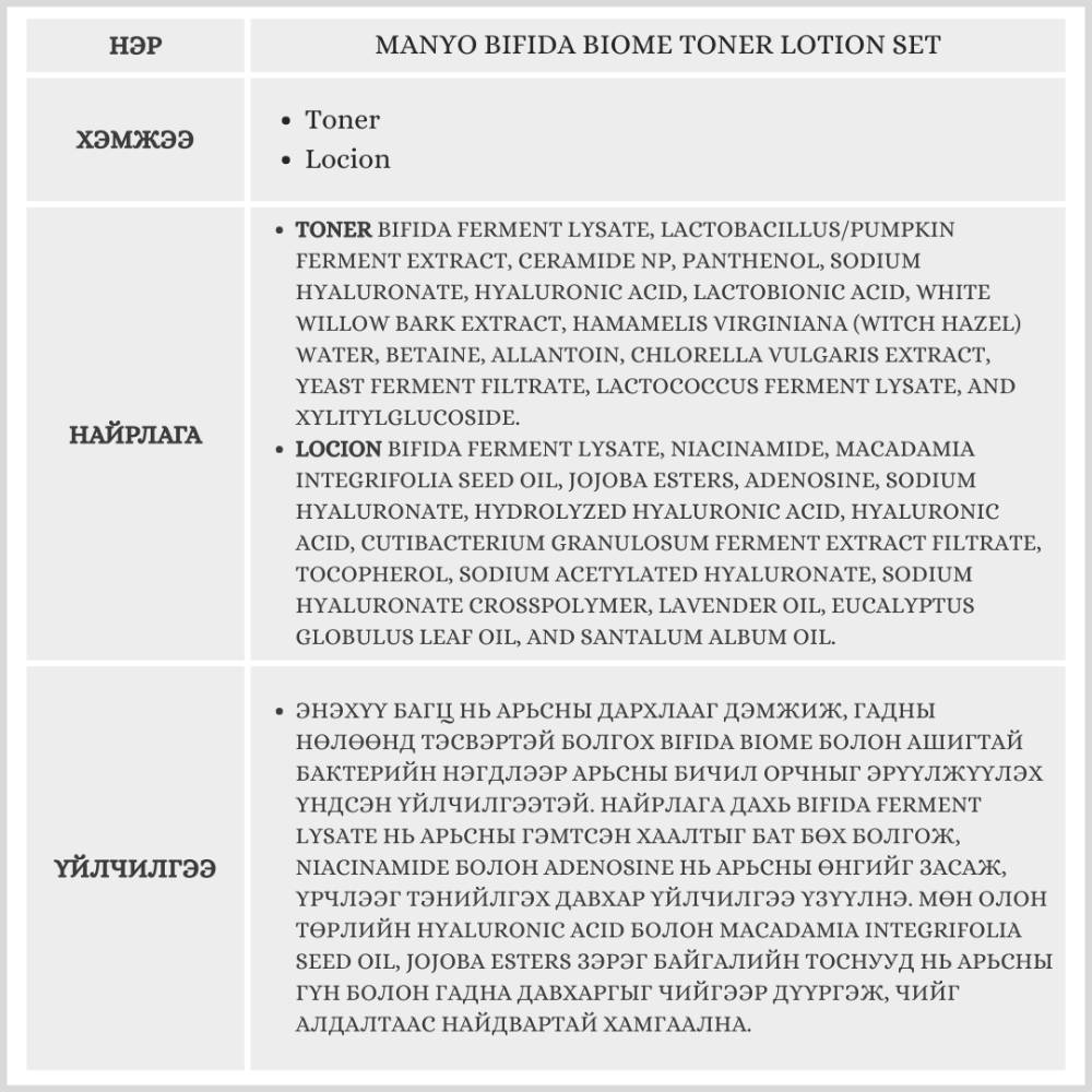 Найрлага дахь Bifida Ferment Lysate болон 5 төрлийн Probiotics нь арьсны микробиомыг эрүүлжүүлж, гадны нөлөөнд тэсвэртэй болгохын зэрэгцээ Hyaluronic Acid нь арьсны гүнд чийгийг удаан хадгалж, залуужуулах үйлчилгээ үзүүлдэг.