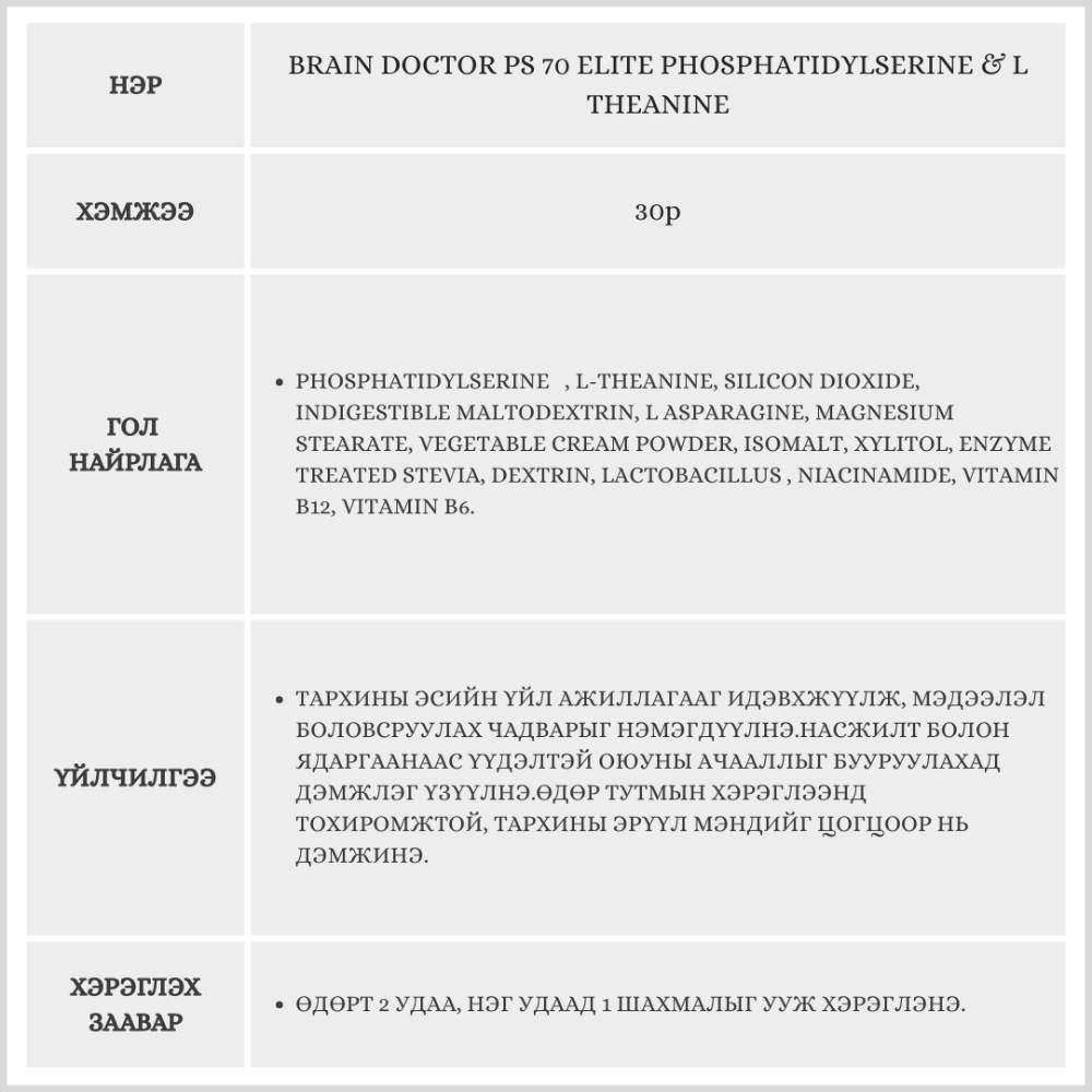 Энэхүү бүтээгдэхүүн нь ой тогтоолт, анхаарал төвлөрөл, танин мэдэхүйн үйл ажиллагааг дэмжиж, стрессийг тайвшруулан анхаарал төвлөрөл болон сэтгэл санааг тогтвортой байхад тусална.