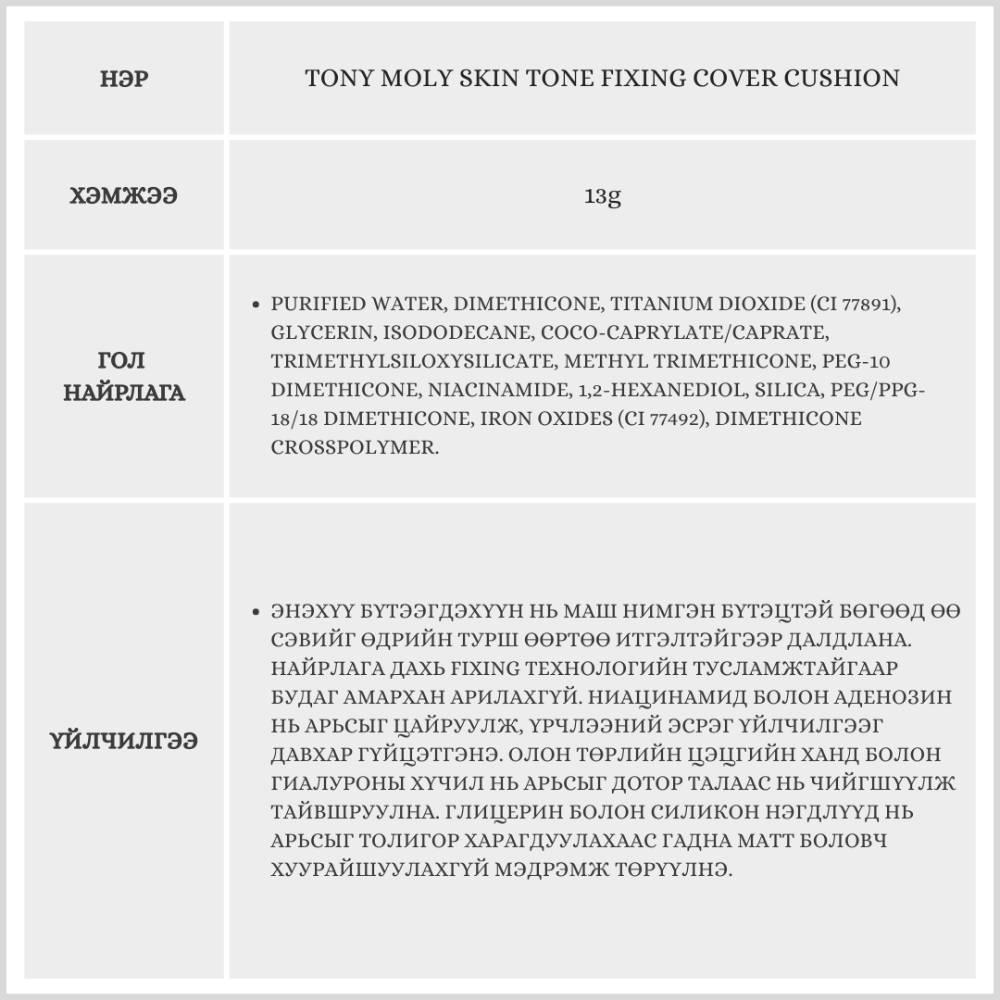 Энэхүү cushion нь арьсны өө сэвийг маш сайн дарж, өдрийн турш арьсанд удаан тогтох зориулалттай суурь крем юм. Арьсны илүүдэл тослогийг хянаж, гадна талдаа матт боловч дотор талдаа чийглэг мэдрэмж төрүүлдэг тул амны хаалт болон хувцсанд амархан наалдахгүй давуу талтай. Запас дагалдана.