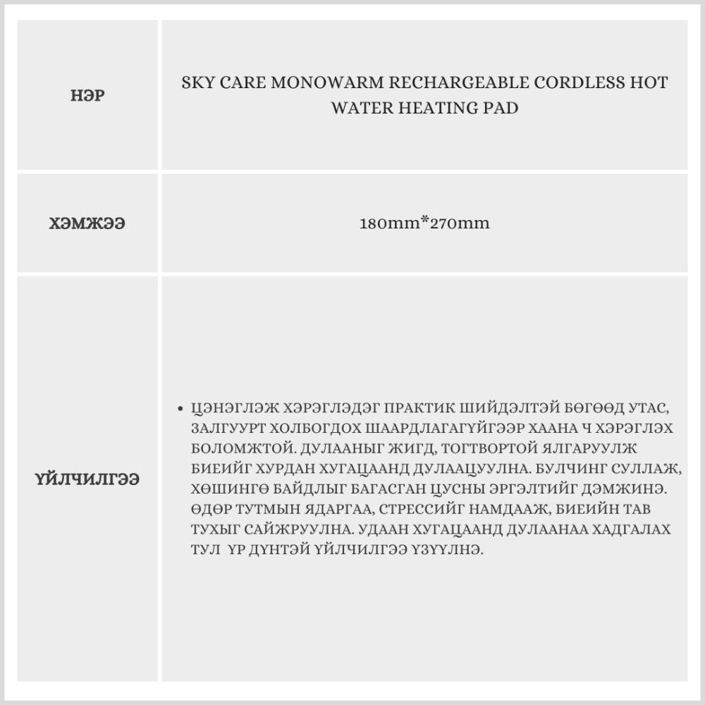 Энэхүү бүтээгдэхүүн нь цэнэглэж хэрэглэдэг онцлогтой, цэвэр усан доторлогоотой тул ус нэмж дүүргэх шаардлагагүй. Нэг удаагийн цэнэгээр 8 цаг хүртэл дулаанаа хадгалж, хэвлий, нуруу, бүсэлхий, үе мөчний өвдөлт болон сарын тэмдгийн үеийн зовиурыг үр дүнтэй намдаана.