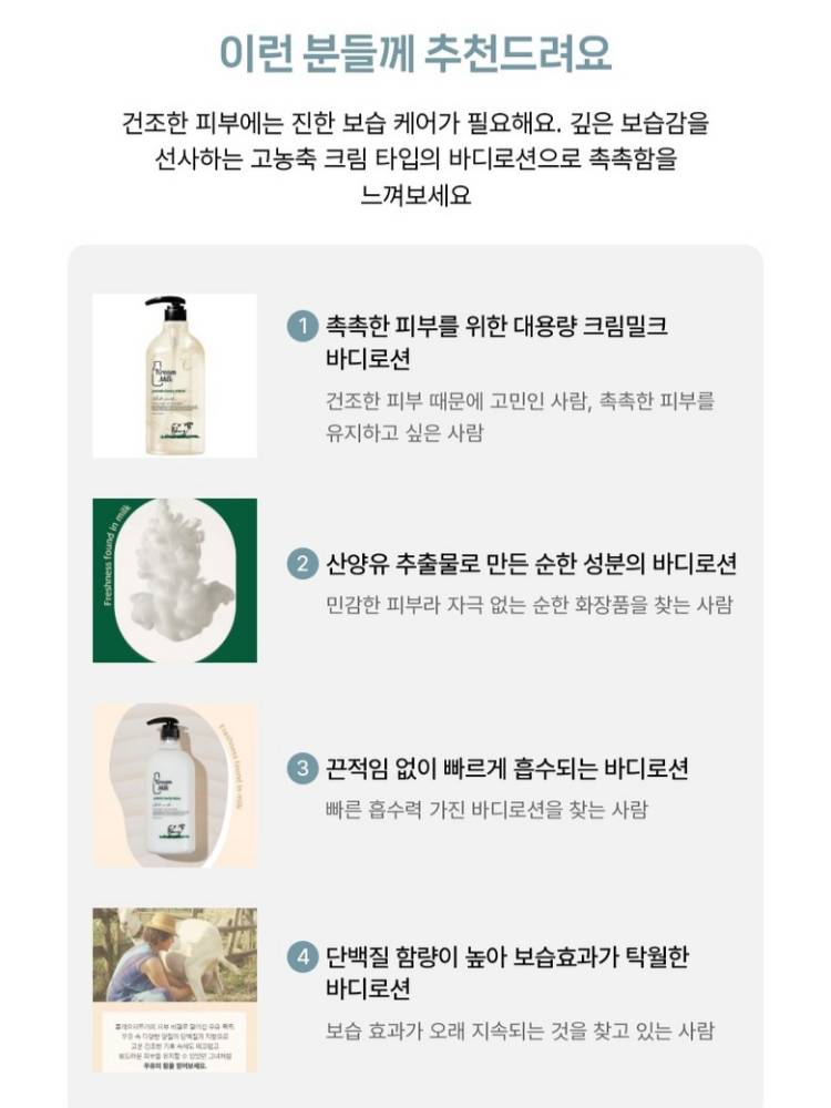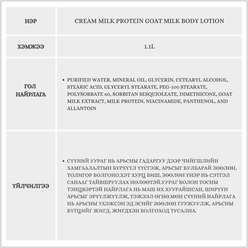 Энэхүү бүтээгдэхүүний найрлагад ямааны сүү агуулагдсан бөгөөд ямааны сүүний уургийн бүтэц нь хүний арьсны бүтэцтэй маш төстэй тул арьсанд маш хурдан шингэж, гүн тэжээл өгдөг.Арьсыг гүн чийгшүүлж, булбарай, зөөлөн болгохоос гадна нурууны батгыг ул мөргүйгээр багасгаж, арилгахад тусална.