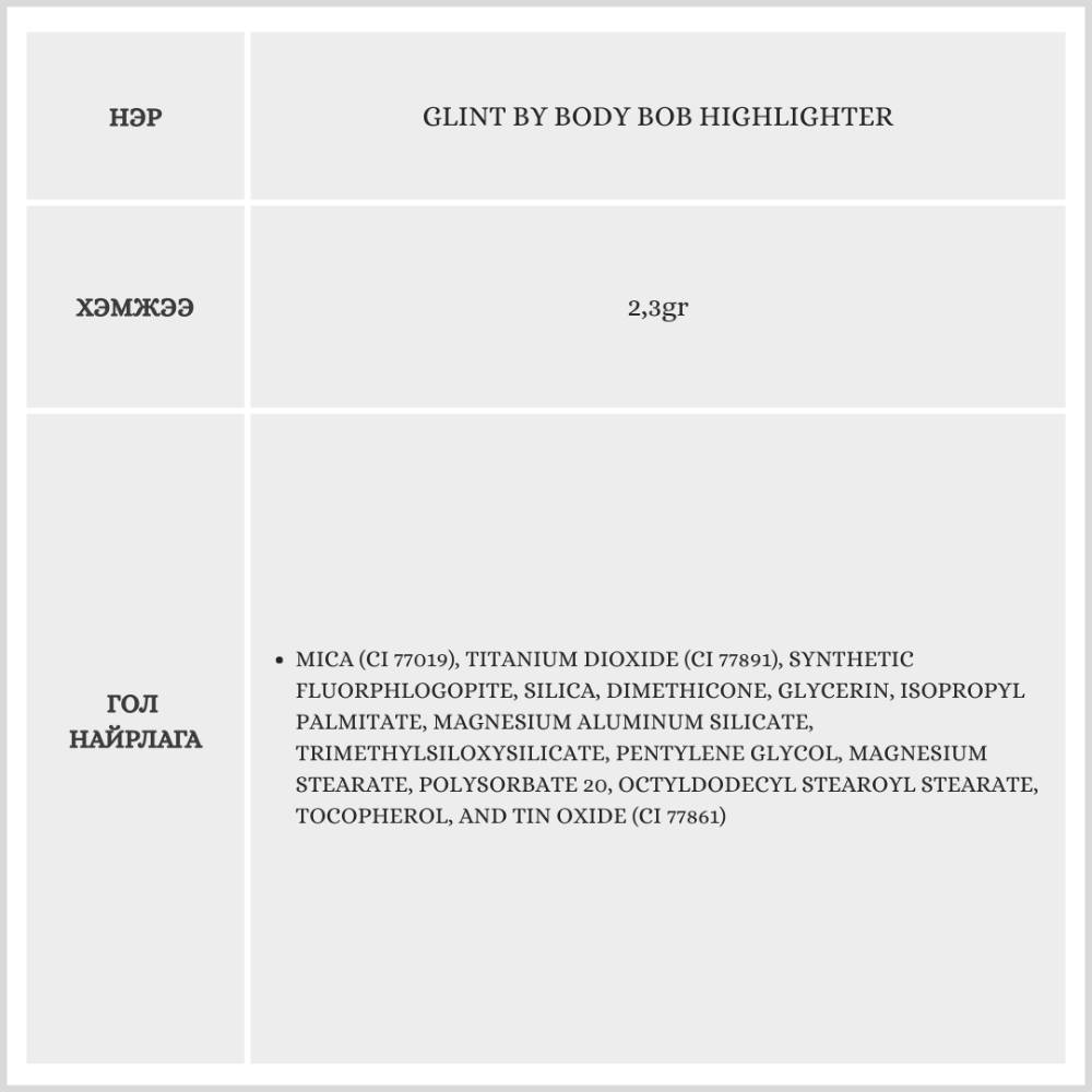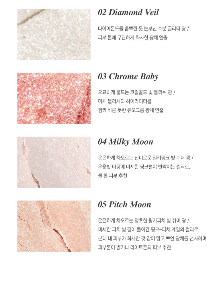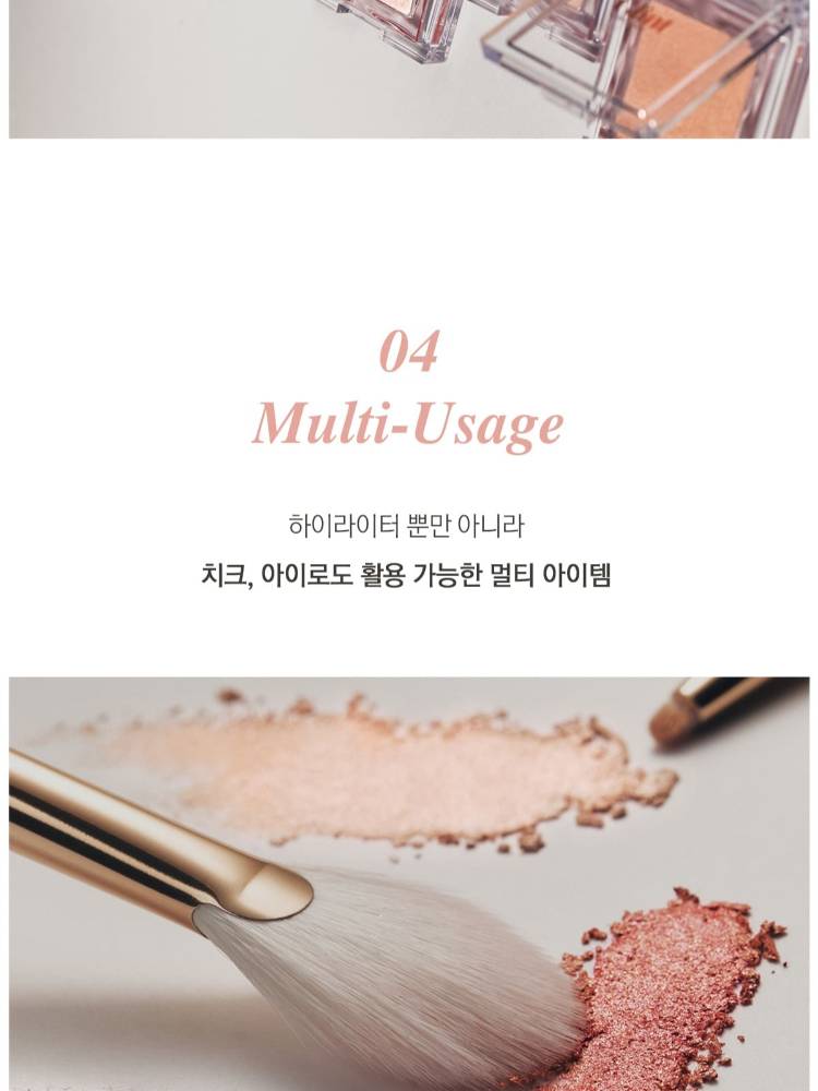 Арьсны өнгийг дарж харагдуулахгүй, зөвхөн гэрэл нэмдэг тунгалаг бүтэцтэй.Шанаа, хамар, нүдний булан , уруулын ховил зэрэг хэсгүүдэд ашигласнаар нүүрний хэлбэрийг илүү тодотгож өгнө.