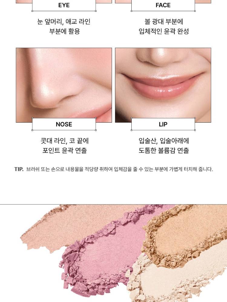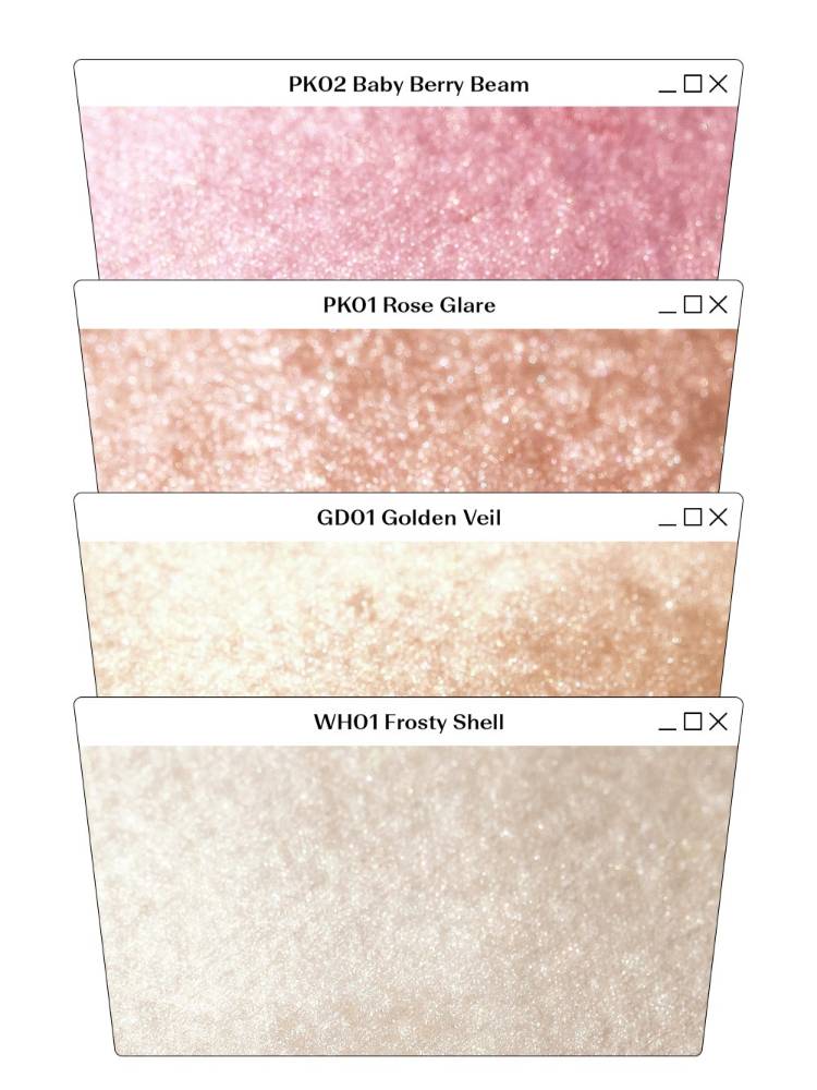 Арьсанд тунгалаг, цэвэрхэн гялбаа өгч дотроосоо гэрэлтэж буй мэт харагдуулна.Нарийн ширхэгтэй, текстуртай тул жигд тархаж, бөөгнөрөхгүй.Шанаа, хамрын яс, хөмсөгний яс, нүдний дотор булан зэрэгт хэрэглэхэд нүүрний хэлбэрийг илүү тод, цэгцтэй болгоно