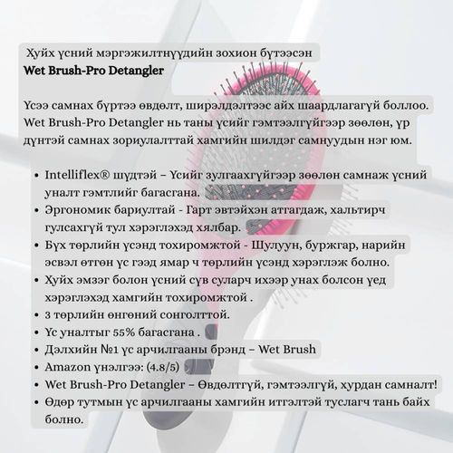 Wet Brush-Pro Detangler – Үс арчилгааны шинэ шийдэл Hойтон үсийг ч амархан, зөөлнөөр самнаж, дайхралтыг багасгана. • Үсээ олон самнах шаардлагагүй • Гэмтэлтэй үсэнд хэрэглэхэд тохиромжтой. • Нойтон үс самнахад тохиромжтой.