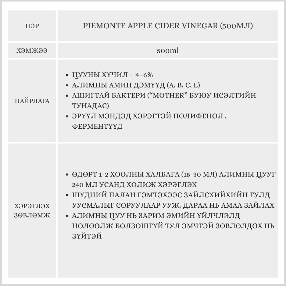 Эрүүлжиж жин хасахад тань туслах PIEMONTE Алимны цуу. PIEMONTE алимны цуу нь органик алимнаас гаргаж авсан,байгалийн исгэлэн алимны цуу бөгөөд эрүүл мэндийн олон талын ашиг тустай бүтээгдэхүүн юм.