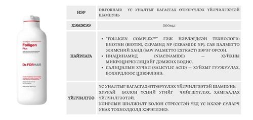 Dr.FORHAIR Үс уналтыг багасгах өтгөрүүлэх үйлчилгээтэй шампунь. Хуурай болон үсний угийг чийгшүүлэх, хамгаалах үйлчилгээтэй. Улирлын шилжилт болон стресстэй үед үс ихээр суларч унах тохиолдолд хэрэглэнэ.