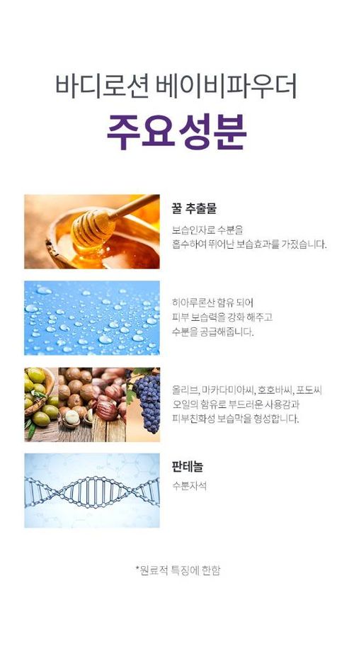 Нярай хүүхдийн үнэр мэт Baby Powder-н үнэрийг шингээсэн биеийн тос. PH5 тай тул арьсийг цочроохгүй. Хуурайшсан, амархан цочирдог арьстай хүмүүст Анхилуун, тансаг үнэртэй, хөнгөн бүтэцтэй лосьон хүсдэг хүмүүст Өдөр тутмын арьс арчилгаанд