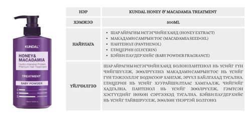 Шар айрагны исгэгчийн ханд болон Пантенол нь үсийг гүн чийгшүүлж, зөөлрүүлнэ. Макaдами самрын тос нь үсийг гүн тэжээллэг бодисоор хангаж, эрүүл байлгахад тусална. Глицерин нь үсийг хуурайшилтаас хамгаалж, чийгийг хадгална. Бэйби паудер нь үсийг тайвшруулж, зөөлөн үнэртэй болгоно.