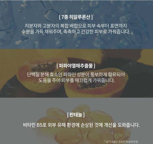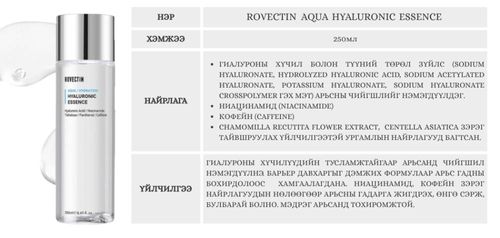 Энэхүү эссэнс нь 7 төрөл бүхий гиалуроны хүчил (Hyaluronic Acid) найрлагадаа агуулсан бөгөөд, арьсын гүн давхрагаас гадна давхарага хүртэл чийгшүүлнэ. Арьсны хамгаалалтын давхарга (moisture barrier) болон чийг алдалтыг бууруулах үйлчилгээтэй.