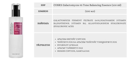 95% Galactomyces Ferment Filtrate агуулсан өндөр концентрацитай эссенс. Арьсны өнгөний жигд бус байдал, хуурайшилт, нүхжилт зэрэг асуудлыг шийдвэрлэнэ. Арьсыг гэрэлтүүлж, булбарай, уян зөөлөн болгох үйлчилгээтэй.