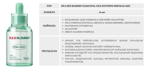 Мэдрэмтгий, батгатай арьсыг тайвшруулах, чийгшүүлэх эмчилгээний серум.төрлийн гиалуроны хүчил + Cica (Centella Asiatica) найрлага нь арьсыг гүн чийгшүүлж, үрэвсэл дарна. Арьсны улайлт, батганы дараах сорви, эмзэг байдлыг бууруулж, эрүүл гялалзсан арьс бий болгоно.